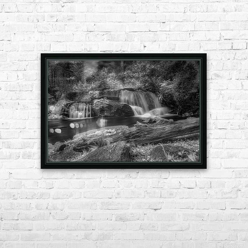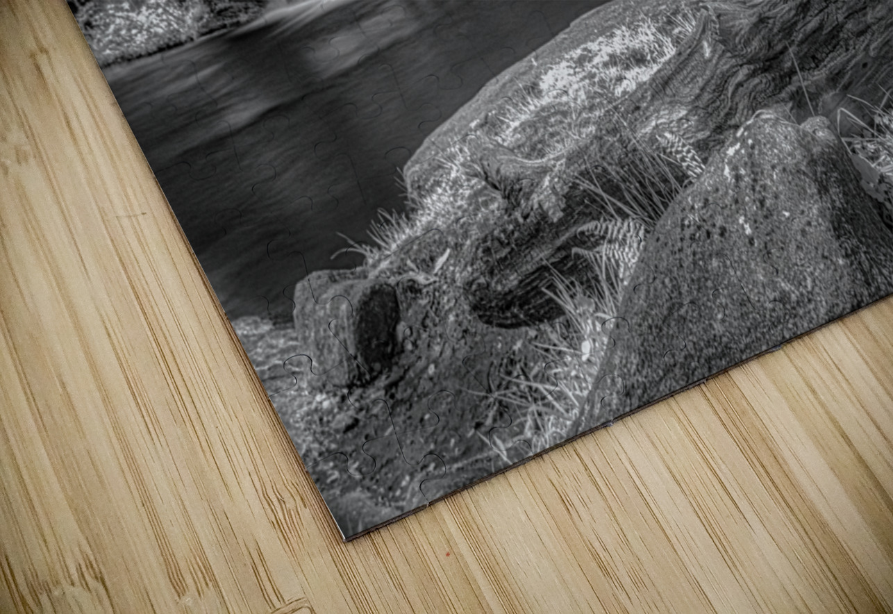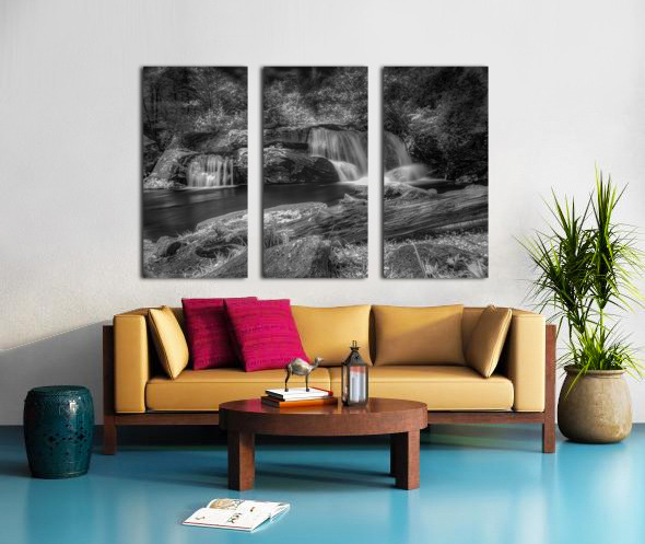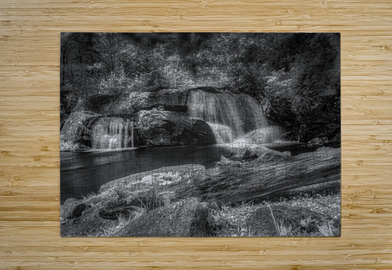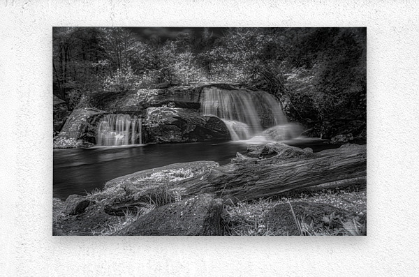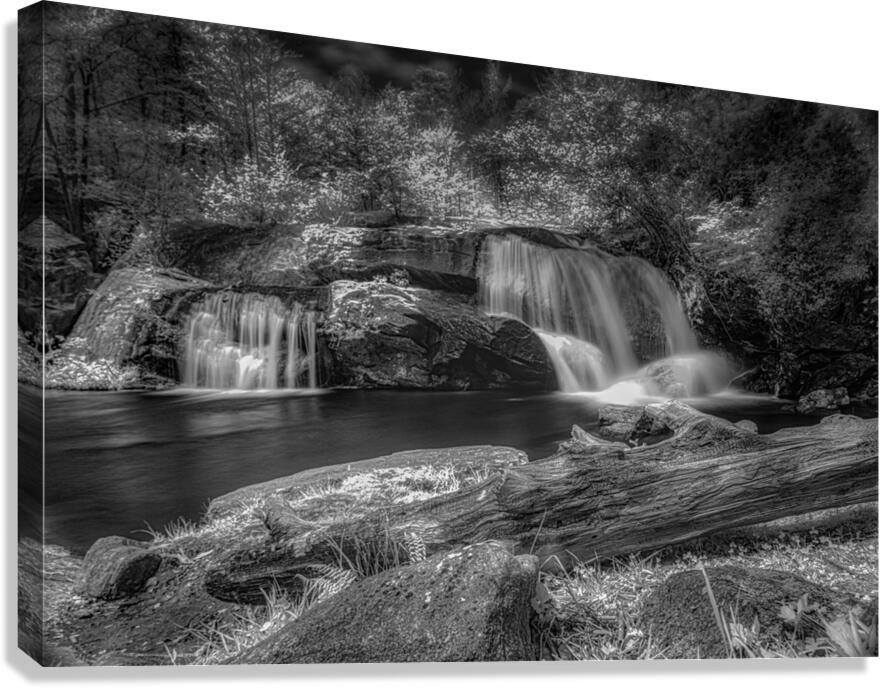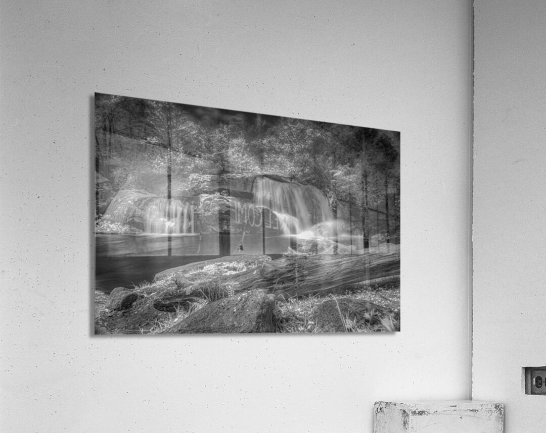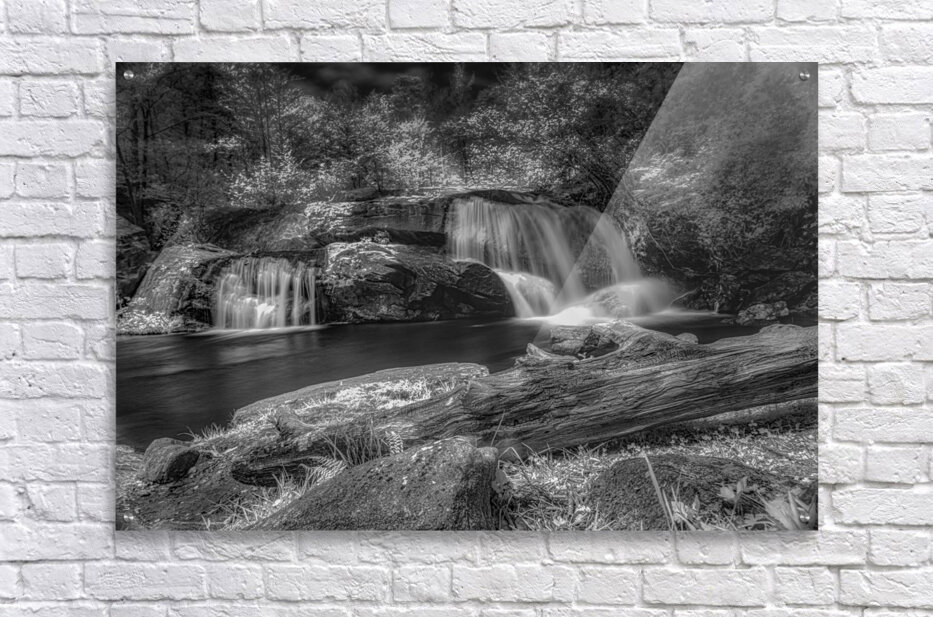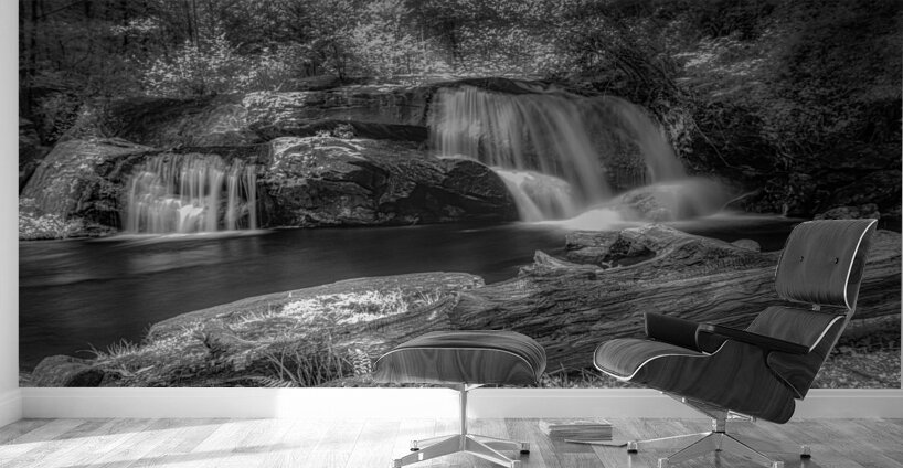 Step into a world of Whispers of Mist: Embracing Tranquility with this enchanting piece of art. A monochrome photograph captures a serene waterfall its cascading streams converging into a still pool below. The surrounding trees are bathed in light their leaves taking on an ethereal quality. A fallen log in the foreground adds a touch of ruggedness to the scene contrasting beautifully with the smooth flowing water. The long exposure used in capturing this image gives the water a silky mist-like appearance adding to the peaceful and timeless aura of the piece. Gaze upon this artwork and feel the magic of nature come alive before your eyes.