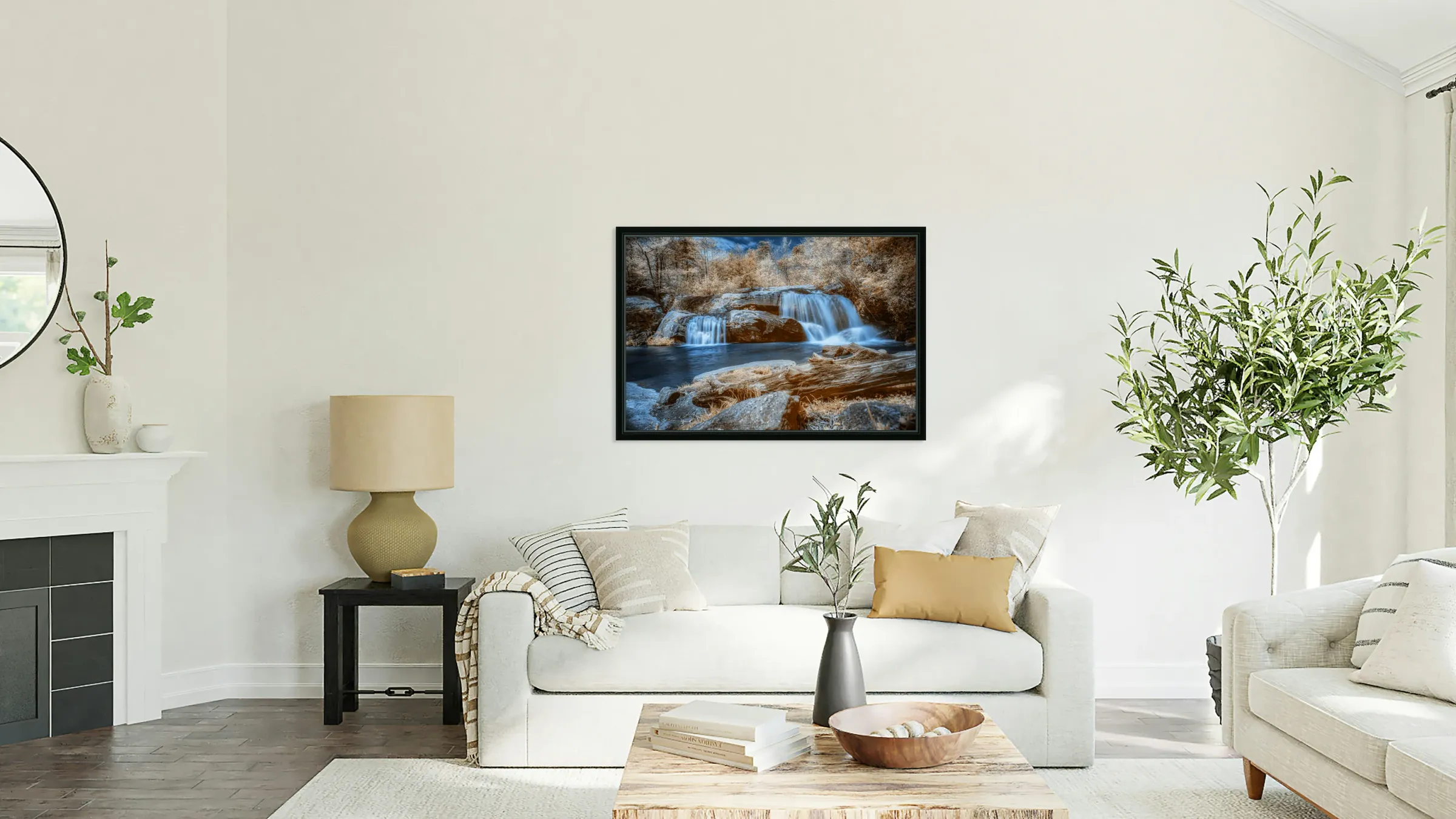 Sapphire Dreams: A Tranquil Waterfall Journey Picture Frame Printing