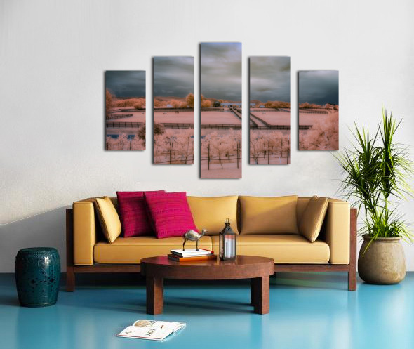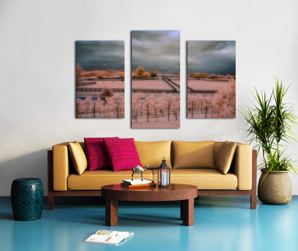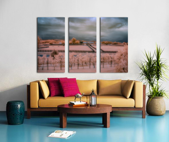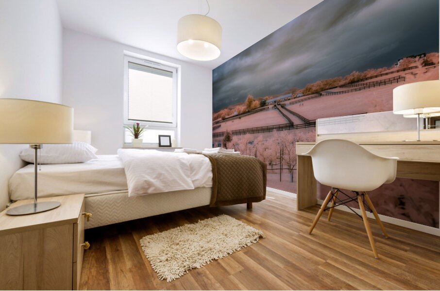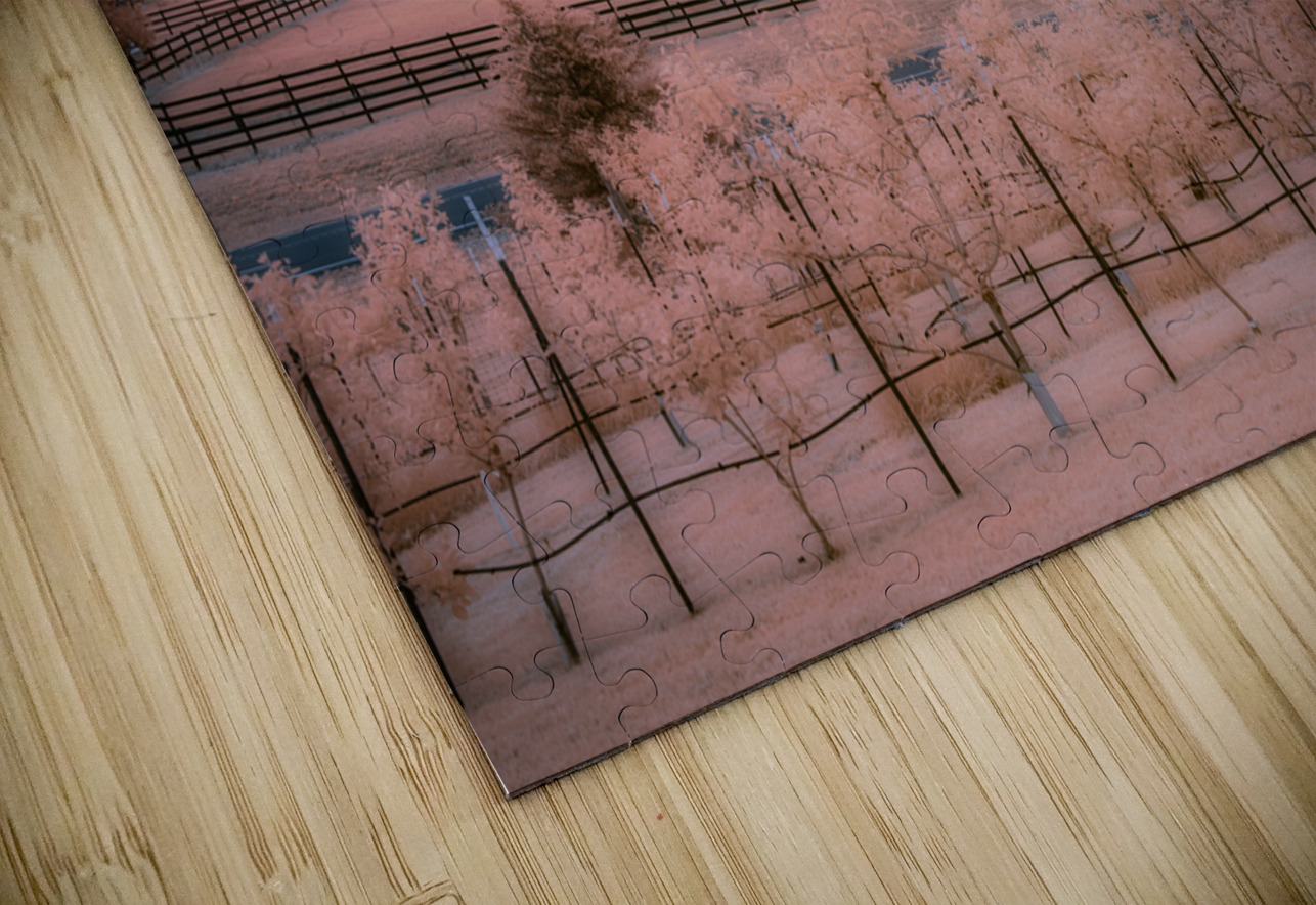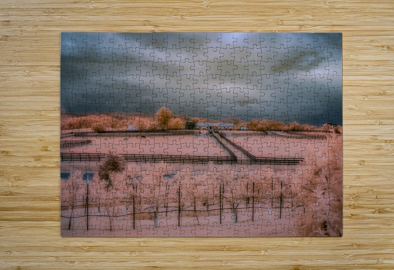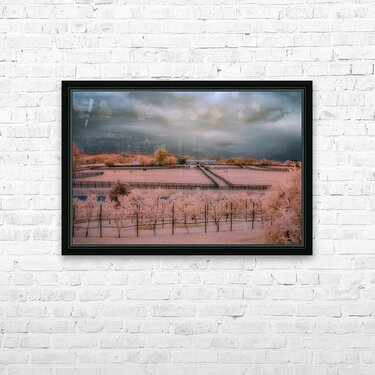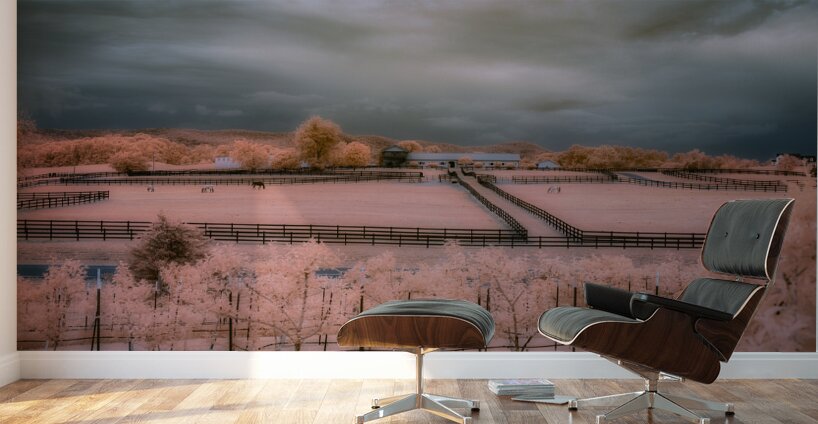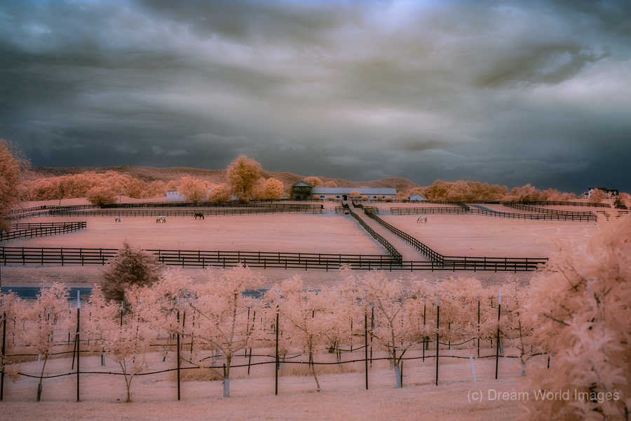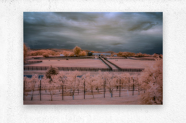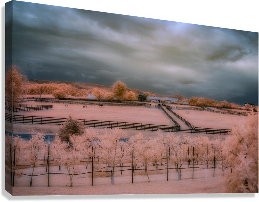 Step into a world where reality bends and colors shift in surreal harmony. A vibrant vineyard stretches out before you its leaves tinged with an ethereal pink glow that defies explanation. Beyond a ranch lies nestled amongst rolling hills its structures standing against the dreamlike landscape. Horses graze peacefully within the fenced paddocks their presence adding to the mystique of the scene. Above the sky swirls with clouds of varying shades creating a sense of foreboding and intrigue. The atmosphere is charged with a sense of impending change of secrets waiting to be uncovered. This artwork bathed in the transformative hues of infrared photography invites you to explore a world where the ordinary becomes extraordinary where the familiar is seen through a different lens.
