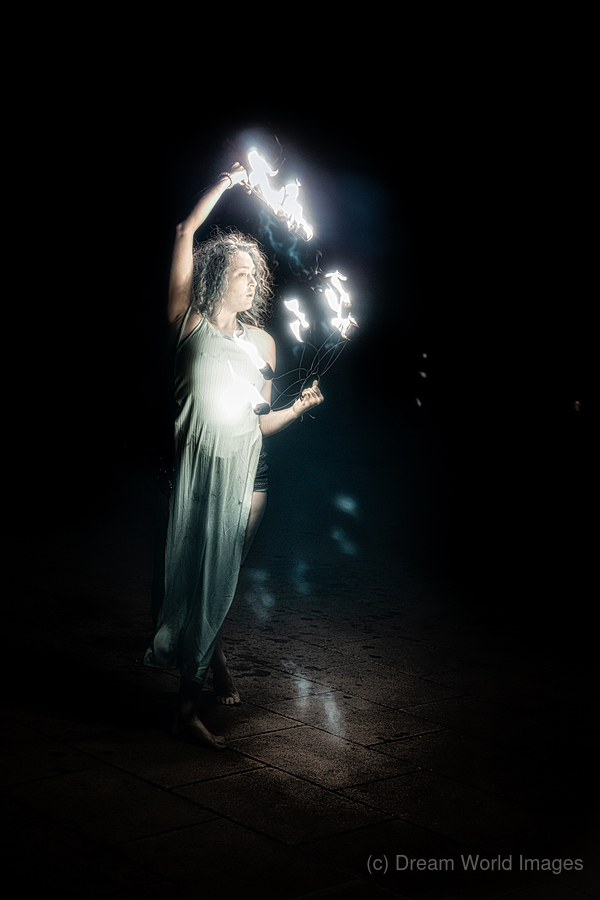 Fiery Night Enchantment is a mesmerizing photographic tableau that immerses the viewer into a realm of luminous wonder. It captures a lone fire perfor...[+]