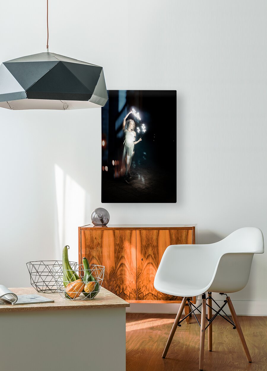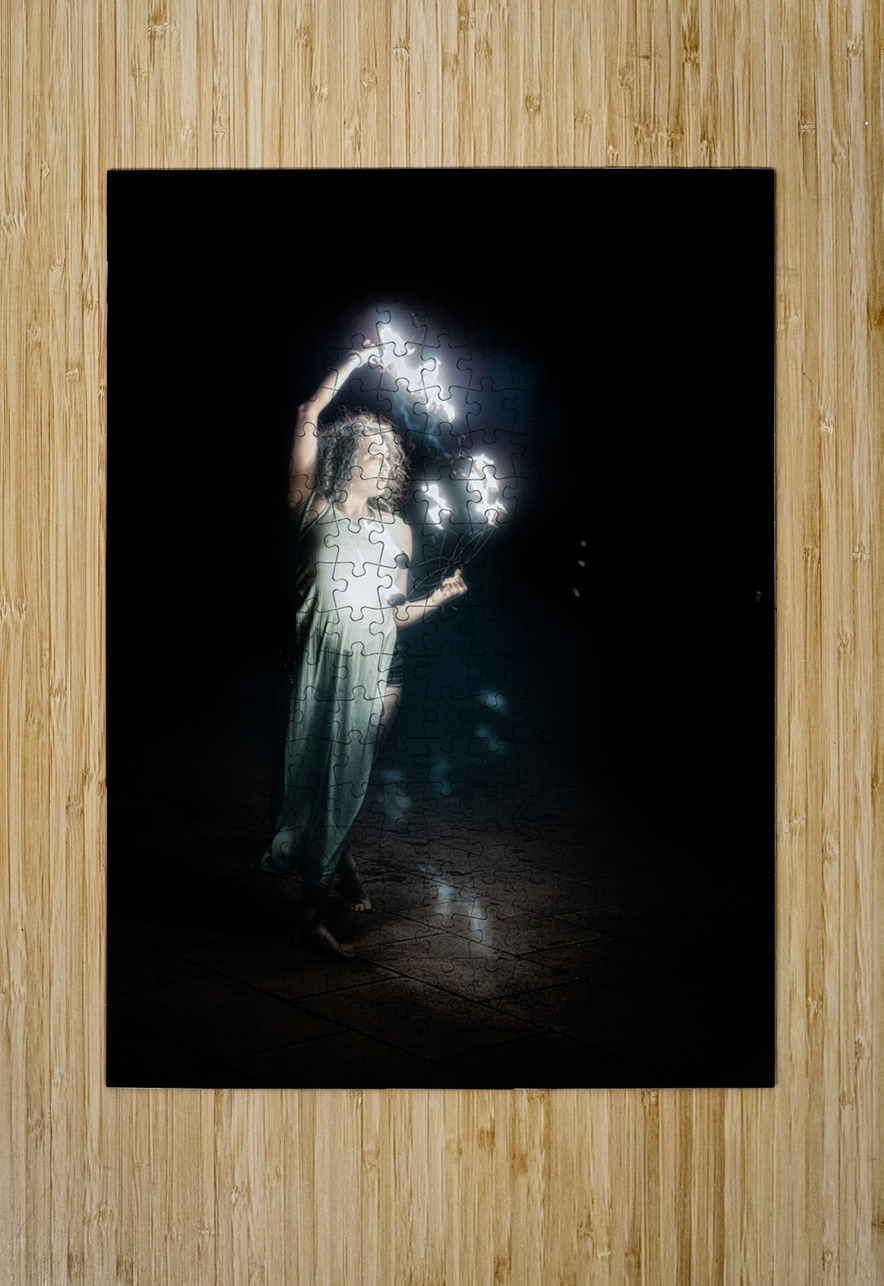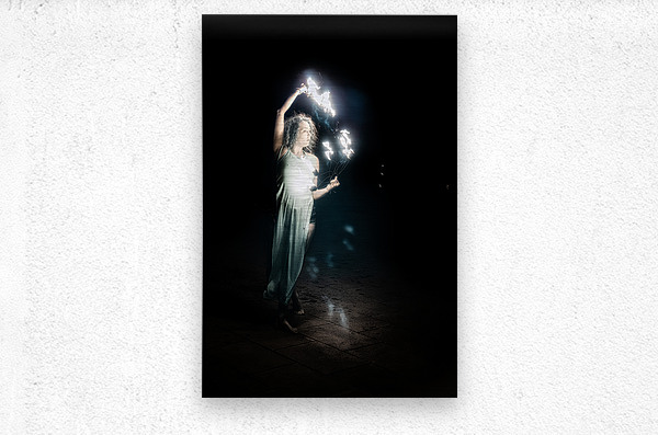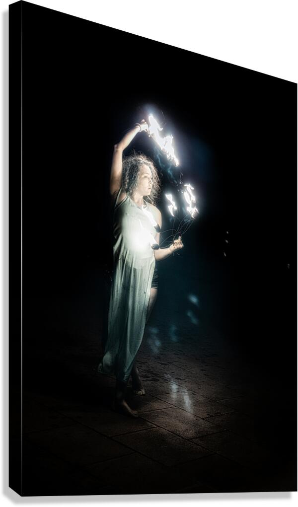 Fiery Night Enchantment is a mesmerizing photographic tableau that immerses the viewer into a realm of luminous wonder. It captures a lone fire performer skillfully navigating the dance of flames against an all-encompassing dark backdrop. Dressed in ethereally light flowing attire the performer appears as a spectral figure their every movement accentuated by the incandescent trails left by the fiery apparatus they command. Amidst the shadowy canvas the brilliance of the flames not only illuminates the scene but also serves as a beacon that draws the eye emphasizing the interplay between light and darkness. The artists composition creates a fascinating tension as if the fire itself were guiding the performers every gesture crafting a dance of light that is both intense and graceful. The viewer is invited to linger on each luminous arc and sweeping motion fully enveloped by the dynamic and otherworldly atmosphere. This creation is a celebration of both movement and illumination an almost magical performance frozen in time. The sheer luminosity of the flames against the night conjures an aura of mysticism and profound enchantment immersing the onlooker in the haunting beauty of the moment.