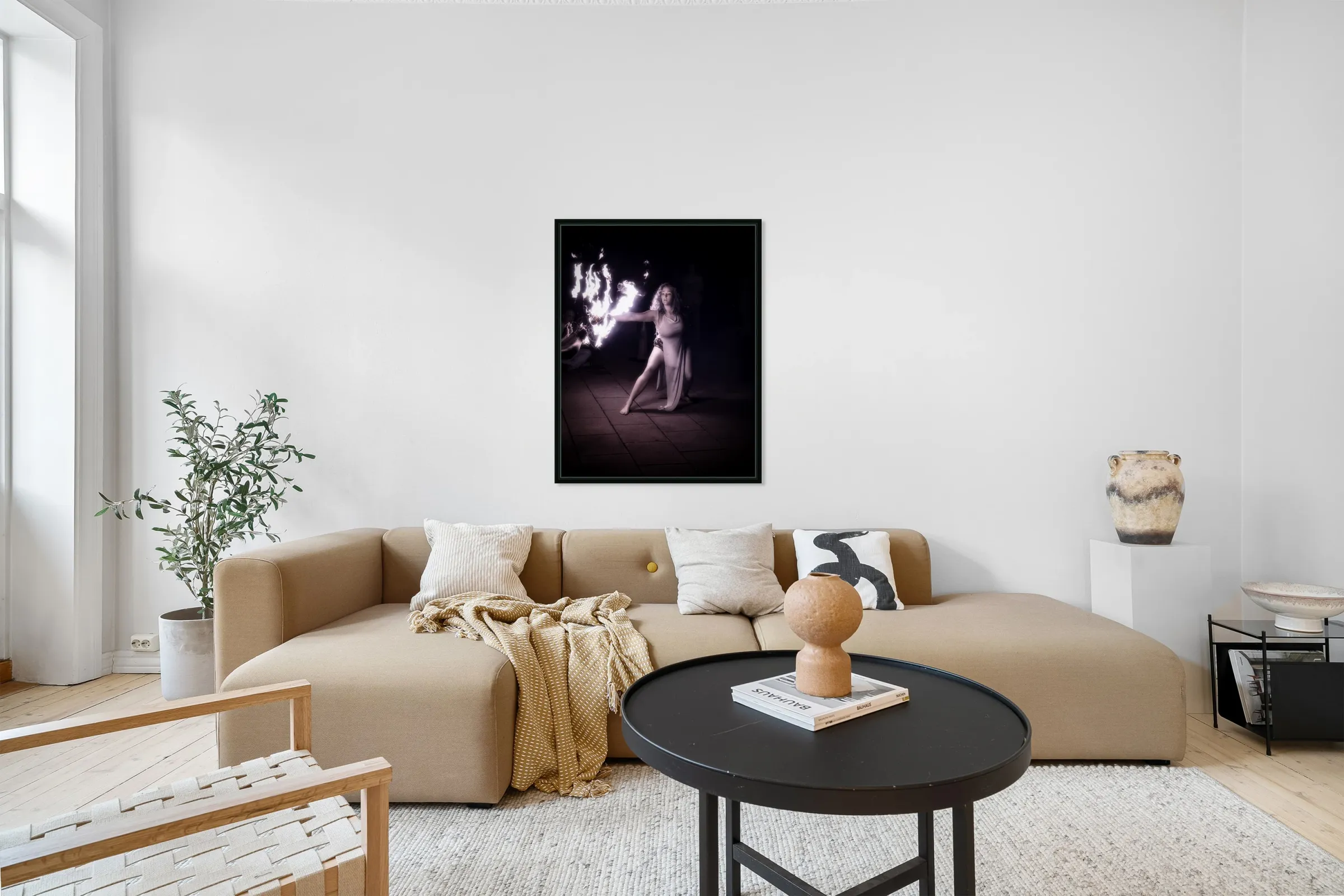 Behold the mesmerizing enchantment of Pyro Poetry an otherworldly photograph that captures the essence of a fiery performance. This striking image immortalizes a woman cloaked in an aura of mystique and strength as she wields a blazing object in her right hand. The incandescent flames illuminate the scene casting dynamic shadows that dance across the urban canvas of a paved surface. Her flowing attire ripples with the motion of her body mirroring the fluidity and grace of her movements. The stark light contrasts created by the fire engender an atmosphere of intensity and profound focus drawing the viewer into a realm where raw power meets eloquent elegance. The interplay of light and dark envelops the scene in a hypnotic glow veiling reality in a silken shroud of magic and allure. In this moment captured through the lens the performer becomes a conduit of primal energy and serene beauty. Pyro Poetry invites the audience to step into a twilight world where the mundane is transformed and every flicker of flame whispers secrets of the beyond.