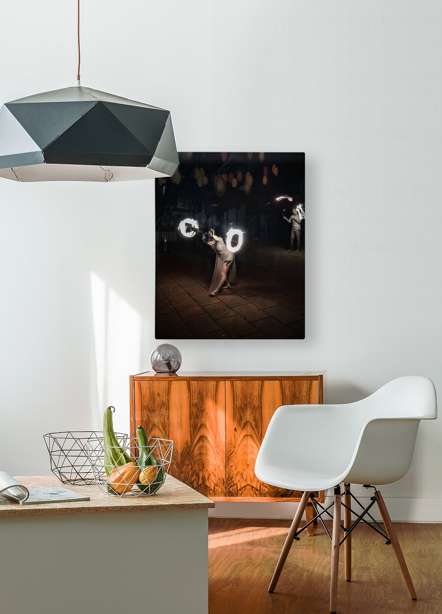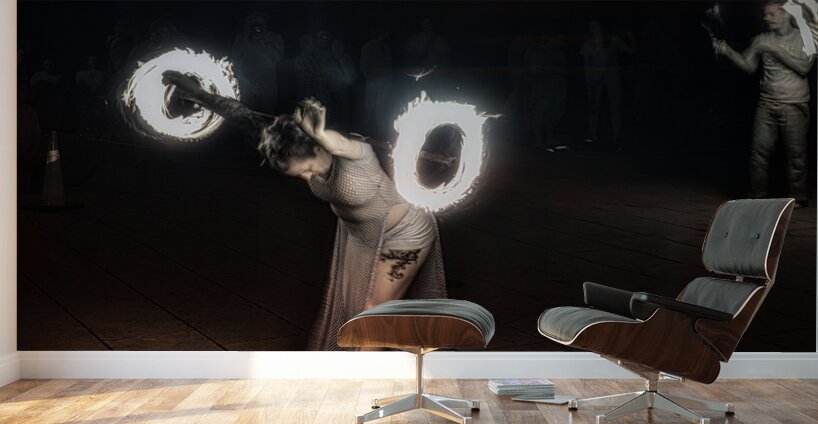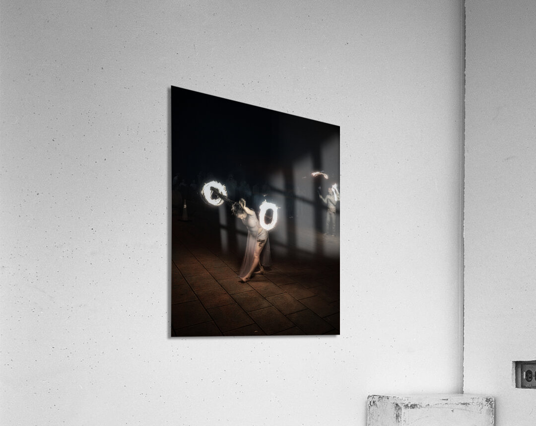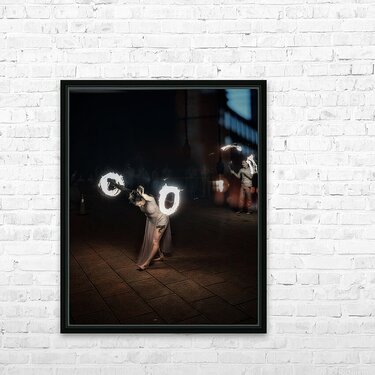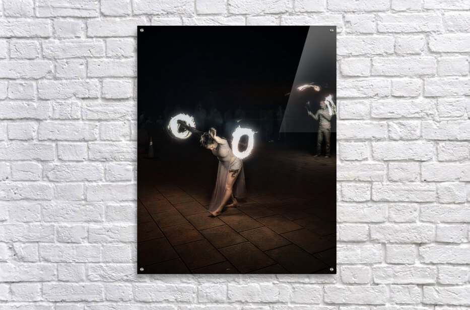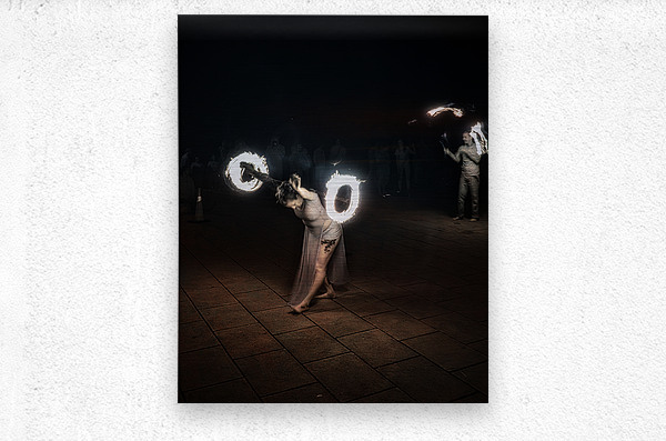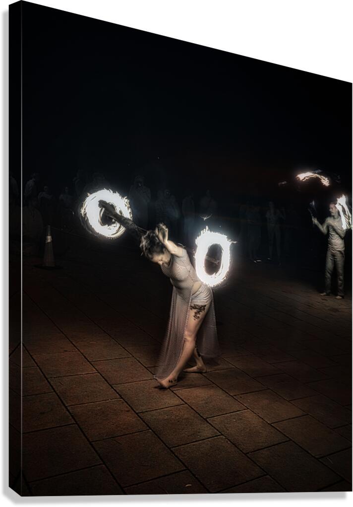 Whirls of Fire is an enchanting and dynamic creation that captures the essence of a mesmerizing fire-dancing performance. In the foreground lies a performer adorned in a flowing ethereal outfit their movements both fluid and captivating. They twirl fire poi with such grace that it seems as though they command the very flames to dance in unity with them. These glowing orbs of fire carve luminous circular streaks into the dark canvas of the night creating a vivid spectacle of blazing light and shadow. The dark background serves as a stark contrast magnifying the brilliance of the flames and drawing attention to the performers fluidity and intensity. The long exposure technique immortalizes each fiery arc creating a continuous radiant narrative that speaks of ancient rituals and mystical energies. The result is an image alive with energy and motion echoing the primal dance of fire embodying both its destructive power and its life-giving warmth. With each flicker and flare the photograph conjures an atmosphere of mystery and wonder transporting the viewer into a realm where the mundane dissolves and only the elemental spectacle of fire and movement remains. This artwork is not just a visual feast it is a portal to an ancient captivating performance an enigmatic dance of light in the dark.