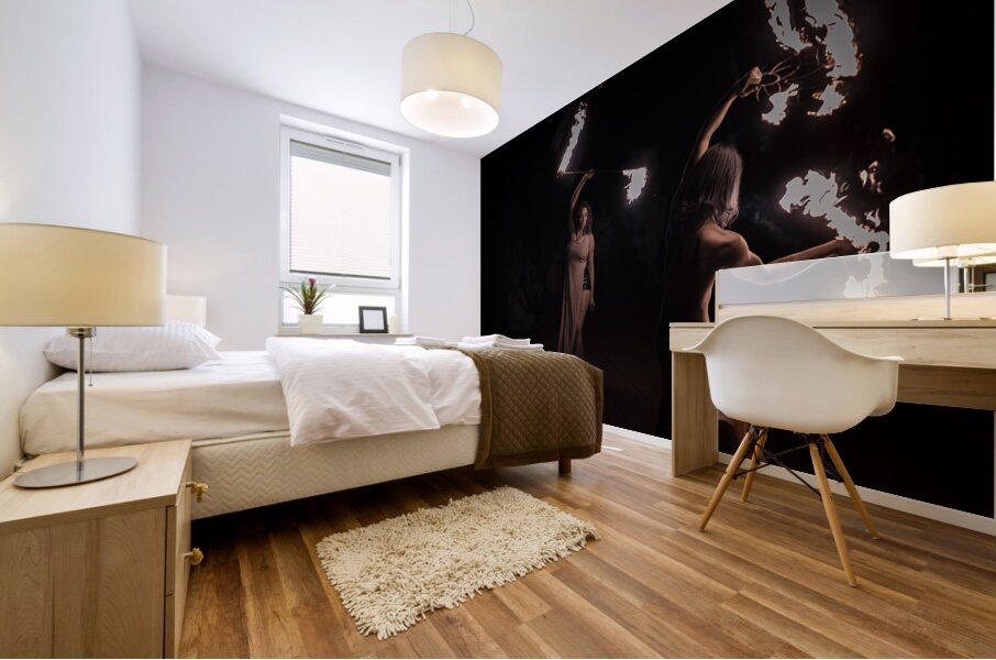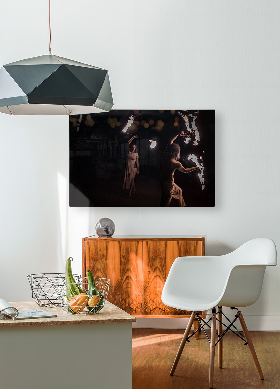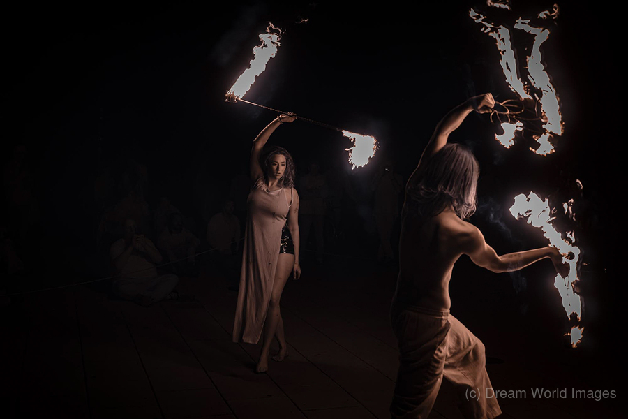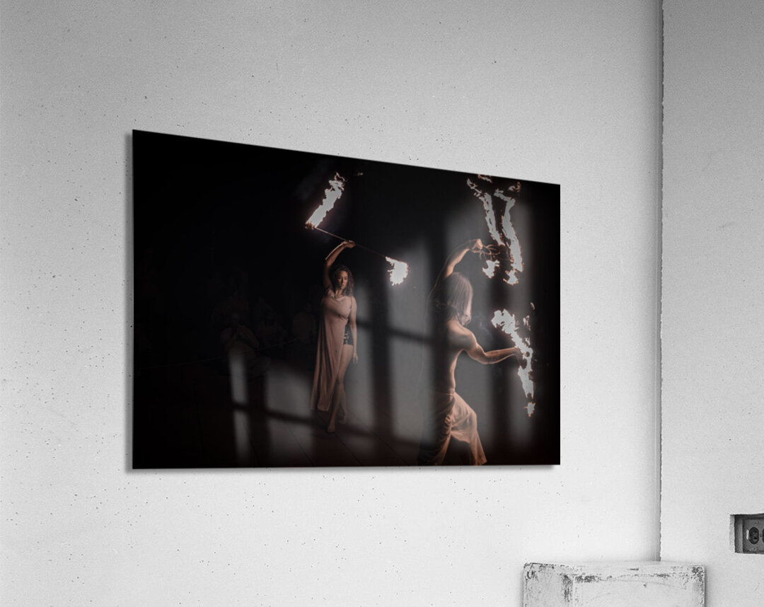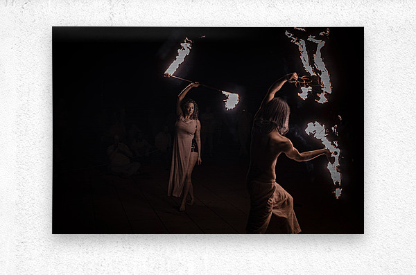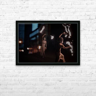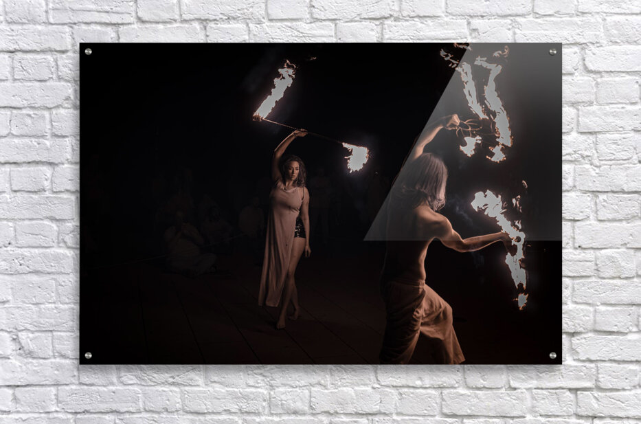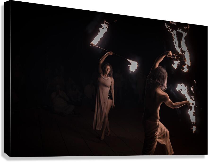 Torchlit Ballet Duo captivates the essence of a fervent and mesmerizing fire-dancing performance. Against the profound depths of a shadowed background