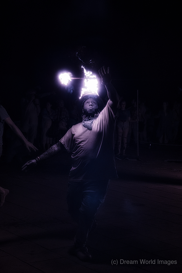 "Flame Alchemist in Shadow" is an entrancing nocturnal scene, where a master of fire commands both light and darkness. The performer, poised in the ve...[+]