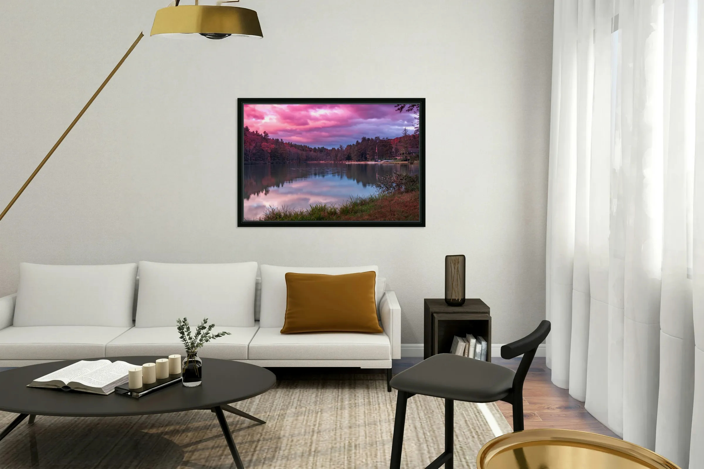 Reflections at Camp is a mesmerizing photographic journey into a serene lakeside realm where the ethereal embrace of either dawn or twilight blankets the scene in a symphony of vibrant pinks and purples. The celestial hues of the sky meld seamlessly with the tranquil surface of the lake transforming it into a flawless mirror that doubles the splendor of the heavens above. The dense forest standing as silent sentinels frames this mirrored world with a tapestry of autumnal greens and reddish-browns each tree a wise old guardian of secrets whispered by the wind. The landscape veils itself in an aura of tranquility punctuated only by the modest structures along the right edge— a small building a flag that whispers tales untold and what seems to be a dock inviting souls to pause and reflect. These elements inject a rustic charm reminiscent of timeless quiet retreats where one can truly meld with natures lullaby. Lush grasses and a profusion of verdant flora dominate the foreground their untamed beauty a testament to the untouched pristine splendor of this secluded haven. The photographic masterpiece whispers of reflections not just seen but felt—of a place where time slows and tranquility reigns supreme allowing the beholders mind to wander freely into the depths of natures mystique.