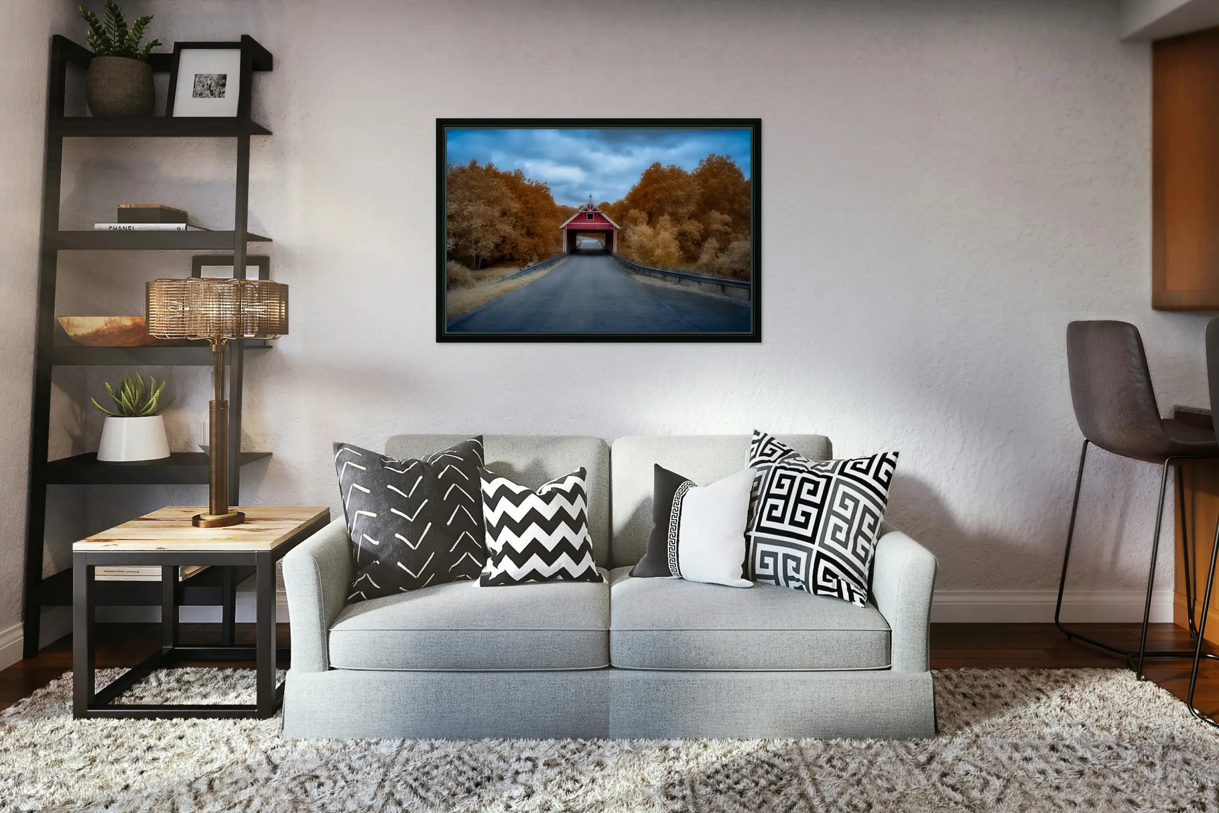Welcome to a realm where the ordinary merges with the extraordinary, unfolding through the "Infrared Serenity: The Red Bridge" canvas. This mesmerizing artwork is a portal to an alternate dimension where the familiar becomes the fantastical. The piece's impressive size encapsulates an entire world within its boundaries, crafted meticulously through the ethereal medium of infrared photography. Behold the scene—a red-covered bridge, its vibrant hue unwavering and resolute, standing as the central sentinel amidst a symphony of autumnal splendor. The trees, adorned in rich tones of orange and gold, cast an enchanting spell over the landscape. As if touched by a magician's wand, the foliage seems to whisper secrets from a bygone era, each leaf a page in an ancient tome. Above, the sky is a tapestry of moods—clouds swirl and gather, weaving a dramatic and evocative contrast to the serenity below. Like a river of time, the smooth road leads one's gaze directly to the bridge, drawing the viewer inexorably toward its mysterious allure. This masterpiece transcends mere representation, blending the rustic charm of the countryside with vivid, otherworldly colors. It captures a moment that is both timeless and fleeting. This serene yet powerful tapestry invokes peace despite its bold contrasts. The interplay of light and shadow, color and form, crafts an atmosphere that beckons the viewer to step in and explore the enigma that lies just beyond the visible. Every element within this wondrous frame has been composed to guide you deeper into its tranquil embrace, inviting contemplation and reflection. This is not just a vision to behold but an experience to be felt—a passage to a mystical, serene world that defies the boundaries of reality.
