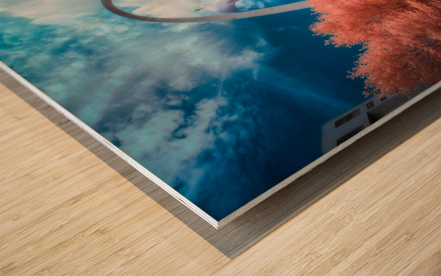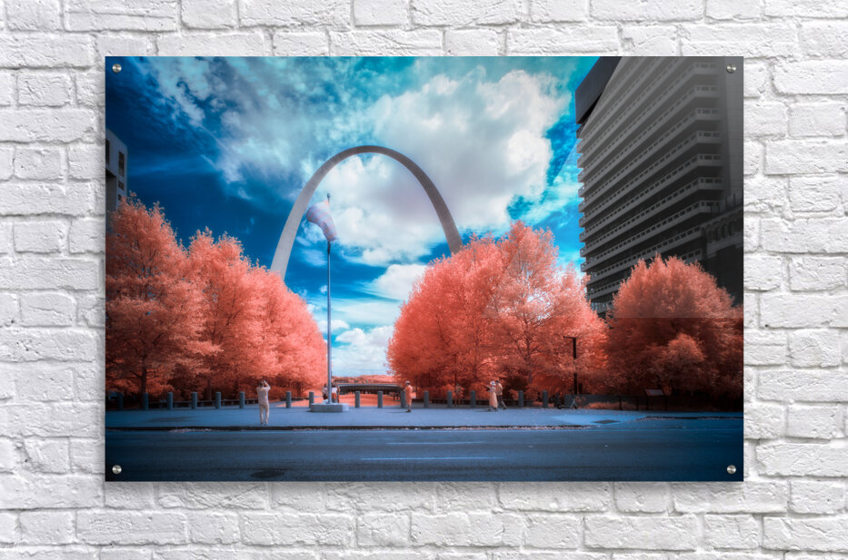 Archway to Surreal Horizons is an arresting piece that transcends the boundaries of reality inviting the viewer to step into a realm where the commonplace morphs into the otherworldly. This mesmerizing infrared photograph captures a grand arch standing as a sentinel amidst a dreamscape where natures colors defy conventional hues. Framed by trees adorned with intensely vivid red and orange foliage the arch seems to pulsate with an almost mystical energy juxtaposed against an expansive sky of cobalt blue strewn with wisps of white clouds. In this surreal tableau the spectral rays of infrared light imbue the surroundings with an ethereal quality transforming the trees into veritable sentinels of a fantastical world. The arch positioned majestically at the center reaches skyward serving not just as a physical structure but as a portal to unseen dimensions. Below this celestial gateway people amble photograph and gaze in awe their presence lending scale and humanity to the surreal setting. Their mundane actions root the scene in our reality even as the hyperreal colors and atmosphere suggest a transcendence into the extraordinary. The artwork’s dreamlike quality evokes a sense of wonder and contemplation presenting a familiar urban landscape through a lens of enchanting distortion. The viewer is guided through an enigmatic journey where every element—natural or man-made—conspires to blur the lines between the known and the imagined the real and the fantastical.