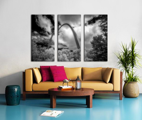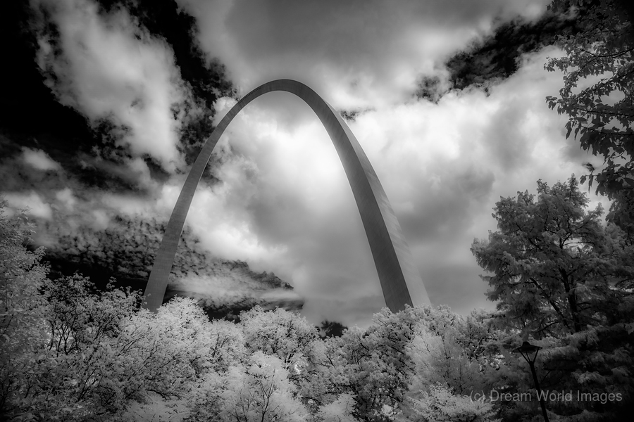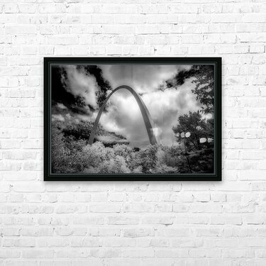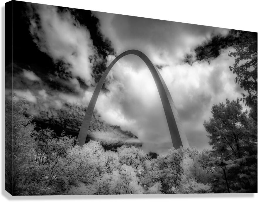 This evocative monochrome photograph titled Infinite Curves in Saint Louis captures the majestic Gateway Arch in a way that feels both timeless and powerful. The arch ascends magnificently into a textured sky its sleek curved structure standing in stark contrast against the dramatic backdrop of swirling clouds. This infrared artwork transforms the scene lending an ethereal quality to the composition as the natural beauty of the surrounding trees frames the bottom of the image and introduces depth and context. The choice of a black-and-white palette amplifies the artworks dramatic impact stripping the scene down to its most essential elements and allowing each detail to shine with clarity. The viewer is drawn into a moment that transcends time where the natural world and human achievement blend harmoniously. This photograph does more than capture a landmark it elevates it into a symbol of aspiration and unity inviting the audience to reflect on the infinite possibilities that lie within the seamless blend of nature and ingenuity.