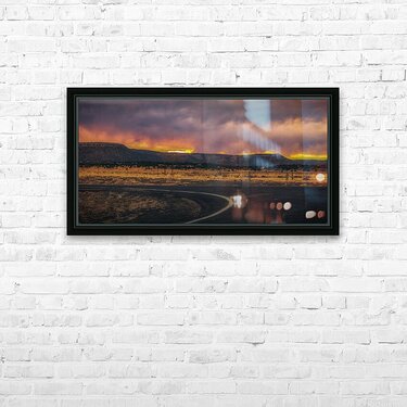 In this captivating photograph lies an enigmatic landscape frozen in the ephemeral breath of sunset. The expansive open terrain beckons as a winding road meanders through the foreground drawing the viewer into its mysterious journey. On the horizon ancient rugged mountains stand sentinel their flat tops silhouetted sharply against a sky alive with drama and intensity. Above dark ponderous clouds swirl and coil shrouding the scene in a veil of intrigue. Yet as if by the hand of an unseen alchemist these brooding clouds give way to a spectacular display. The setting sun ignites the heavens saturating the horizon with a warm golden light that spills mercilessly across the terrain. This celestial glow contrasts vividly with the shadowy foreground creating a sublime tension between light and dark that hints at hidden stories and untold adventures. This photograph is more than a mere landscape it is a narrative of transformation and transcendence inviting the observer to lose themselves in its mystical embrace.