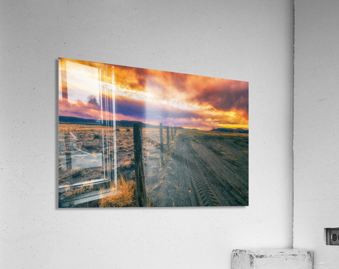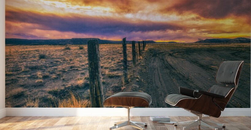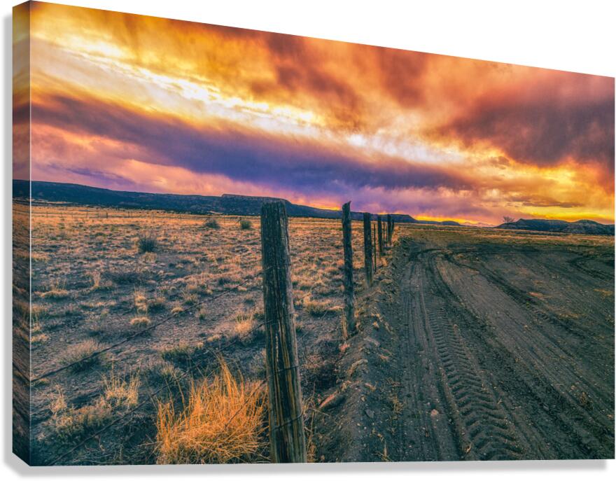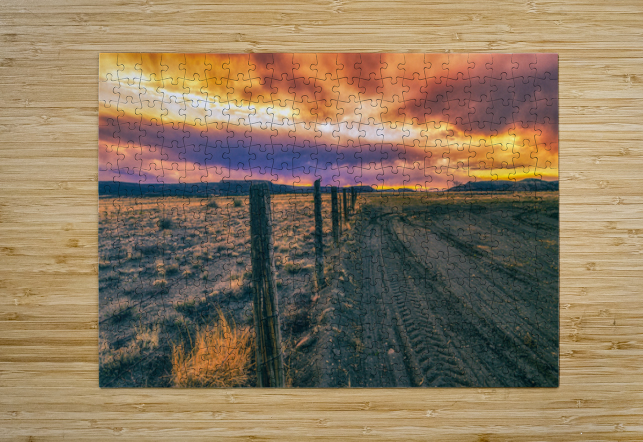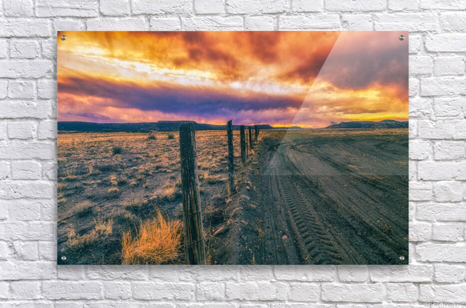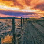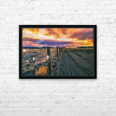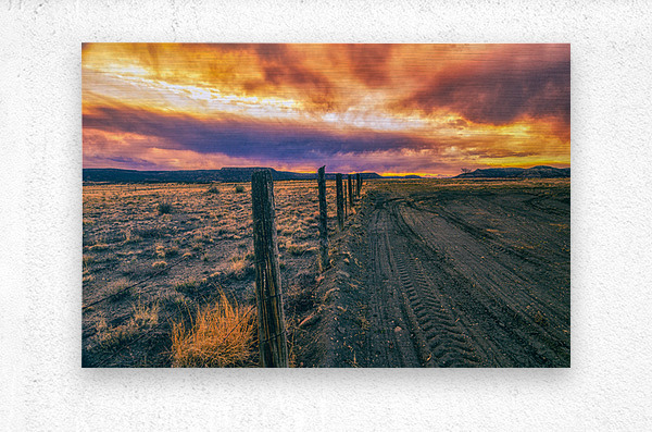 Whispers of a Fiery Horizon is a mesmerizing photograph that unveils a dramatic and almost otherworldly landscape. The scene presents an expanse of dry arid soil punctuated by sparse vegetation that clings stubbornly to life. Cutting through the center of this barren domain a line of rustic wooden fence posts stands resolute subtly guiding the observer’s gaze toward the enigmatic horizon. Dominating the scene is a sky ablaze with swirling tumultuous clouds saturated in an alchemical blend of orange yellow and purple hues. These vivid shades set the atmosphere aflame hinting at the magic of a sunrise or the closing act of a sunset. This celestial firestorm envelops the landscape below in an almost mystical light bestowing upon it an air of sublime spectacle. Deep tire tracks scar the earth to the photograph’s right a poignant reminder of human presence that contrasts sharply with the primal beauty of the natural world. These tracks invite the viewer to ponder the stories and journeys taken across this rugged terrain interweaving the threads of man and nature into a single captivating narrative. The overall mood of Whispers of a Fiery Horizon is one of intensity and dynamism capturing the vastness and raw beauty of an untamed landscape imbued with a sense of mystery and awe.