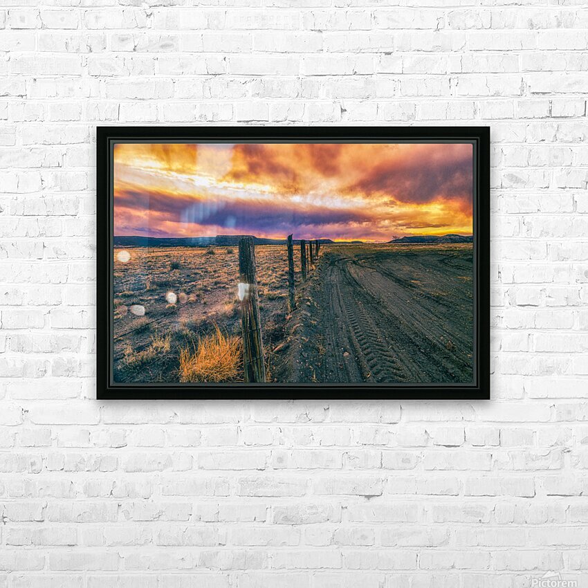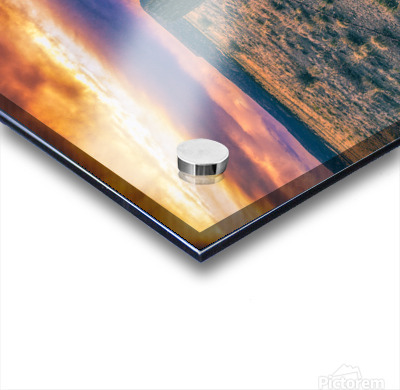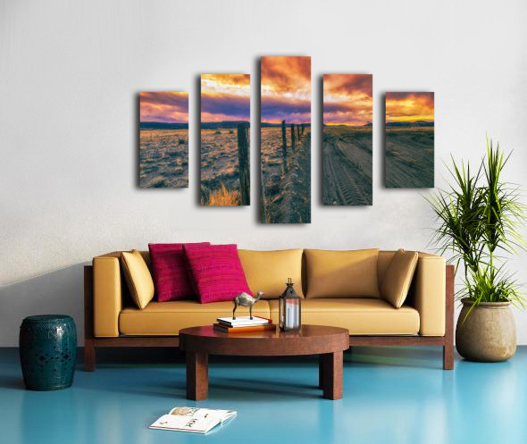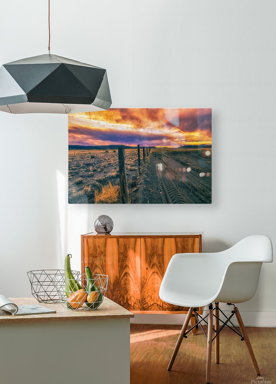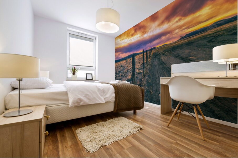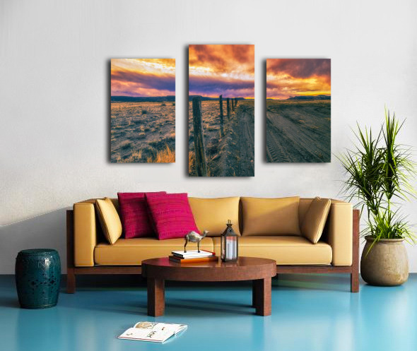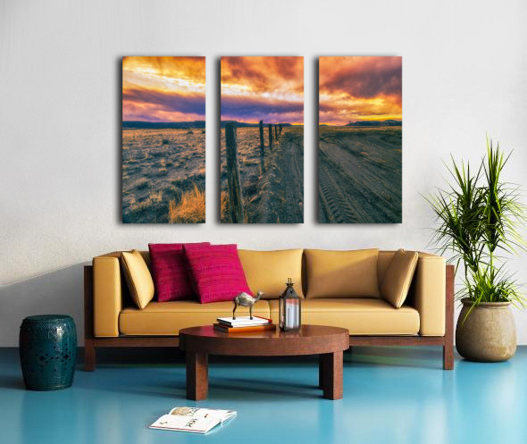 Whispers of a Fiery Horizon is a mesmerizing photograph that unveils a dramatic and almost otherworldly landscape. The scene presents an expanse of dry arid soil punctuated by sparse vegetation that clings stubbornly to life. Cutting through the center of this barren domain a line of rustic wooden fence posts stands resolute subtly guiding the observer’s gaze toward the enigmatic horizon. Dominating the scene is a sky ablaze with swirling tumultuous clouds saturated in an alchemical blend of orange yellow and purple hues. These vivid shades set the atmosphere aflame hinting at the magic of a sunrise or the closing act of a sunset. This celestial firestorm envelops the landscape below in an almost mystical light bestowing upon it an air of sublime spectacle. Deep tire tracks scar the earth to the photograph’s right a poignant reminder of human presence that contrasts sharply with the primal beauty of the natural world. These tracks invite the viewer to ponder the stories and journeys taken across this rugged terrain interweaving the threads of man and nature into a single captivating narrative. The overall mood of Whispers of a Fiery Horizon is one of intensity and dynamism capturing the vastness and raw beauty of an untamed landscape imbued with a sense of mystery and awe.