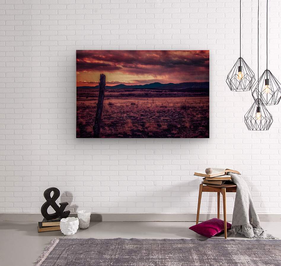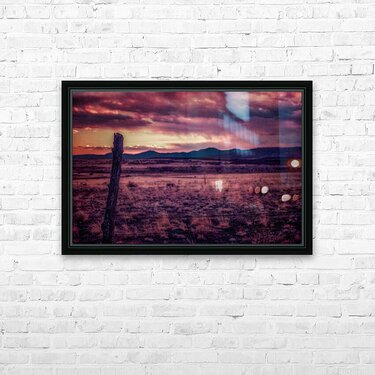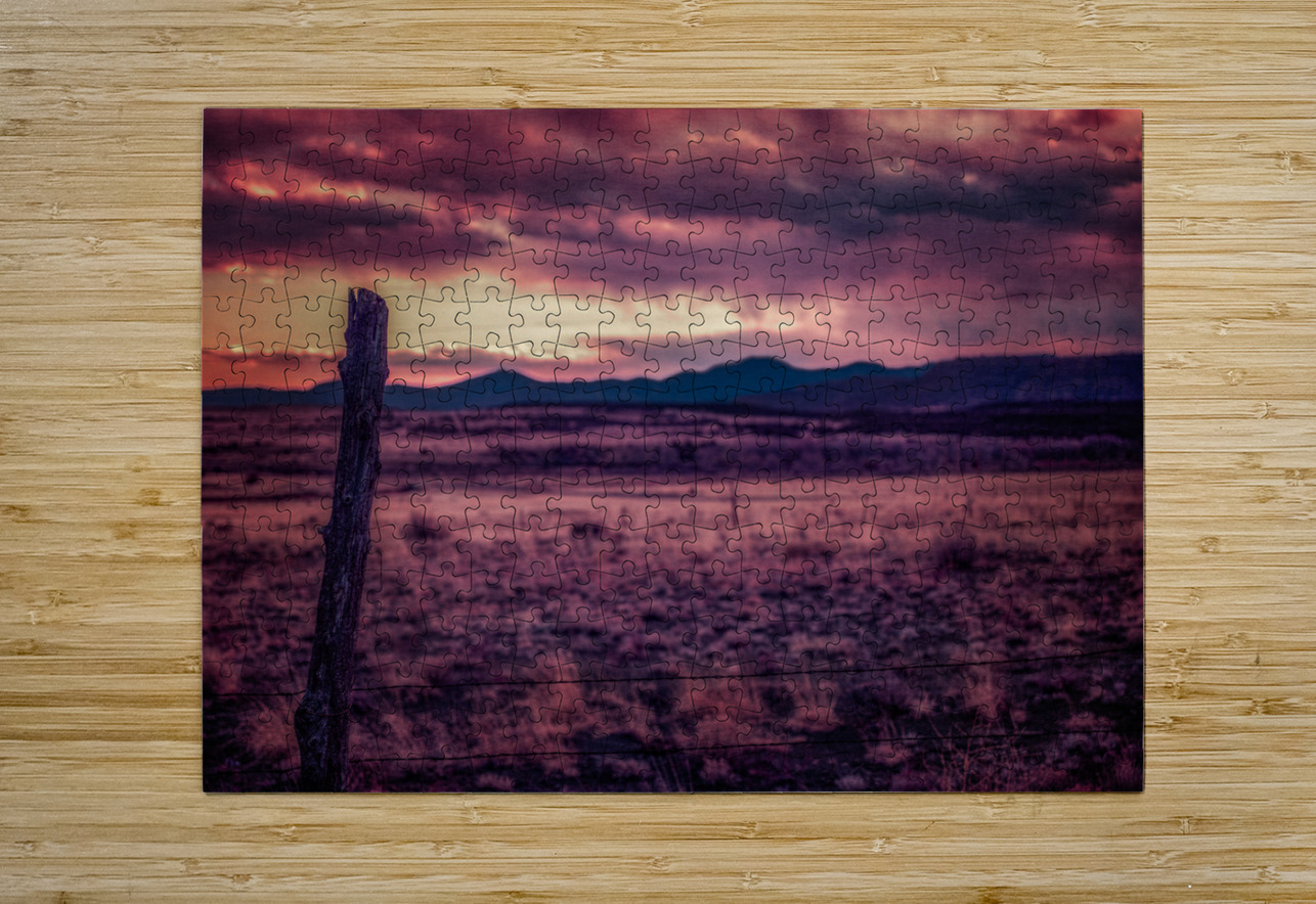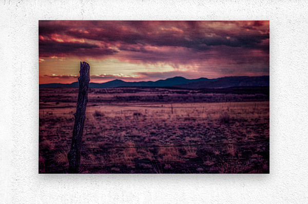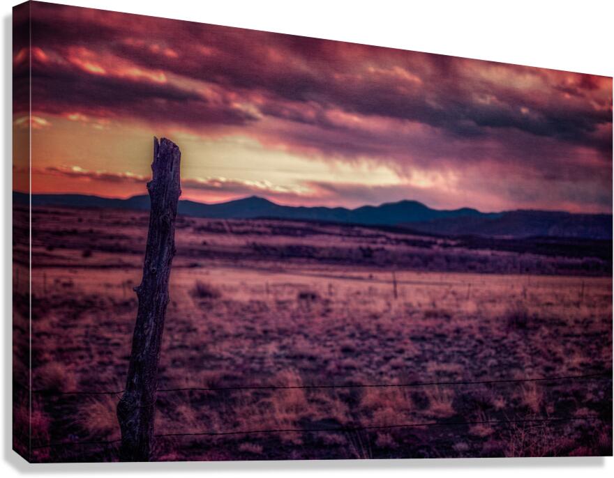 Timeless Solitude Under Painted Skies is an evocative journey through an otherworldly landscape imbued with a mystical ambiance. The scene is dominated by a rugged wooden fence post standing as a sentry in the midst of boundless open terrain. As your eyes traverse the barren earthy field they inevitably ascend towards the rolling hills and mountains that gently kiss the horizon. Above this serene expanse stretches a dramatic sky bursting with a kaleidoscope of colors—pink purple and orange—each hue cascading and intertwining like a sublime tapestry. This celestial display caught in the tender moments of either dawn or dusk bestows a surreal quality upon the tranquil environment as if time itself has paused to admire the ethereal beauty. The stark contrast between the darkened field and the vibrant splendor of the sky amplifies the sense of solitude and timeless wonderment. It is as though the landscape holds ancient secrets whispered by the winds and echoed in the silent watchfulness of the fence post—a sentinel marking the threshold between the earthly and the divine. This photograph invites viewers to lose themselves in its mystical narrative where every glance reveals another layer of enigmatic beauty and infinite tranquility.