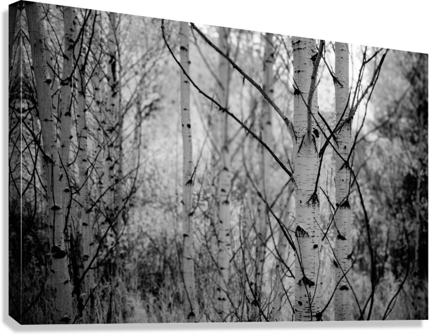 In this mesmerizing black and white photograph the artist unveils a serene forest tableau capturing the ethereal beauty of birch trees. The tall slender trunks delicate yet strong stand in quiet resonance with their surroundings. Intricate textures of the birch bark with its light shade interspersed by dark horizontal lines draw the observer into a realm where natures subtleties command profound contemplation. Here the natural patterns of the forest are revealed in their stark contrasts. The branches ensnared in a delicate dance weave through the air with a whisper of mystery while the smooth trunks of the birches stand stoically guardians of this woodland sanctuary. The artistry lies in the profound simplicity – a calm visual poem that speaks softly yet deliberately. With a shallow depth of field the photograph elegiacally blurs the background focusing the viewer’s gaze on the nearest trees their understated grace evident in every detail. It is a scene both tranquil and enigmatic inviting the onlooker to pause and dwell within the gentle whispers of the forest to find harmony in the intricate balance between light and shadow and to immerse in the quietude that exists within the embrace of nature’s enduring elegance.