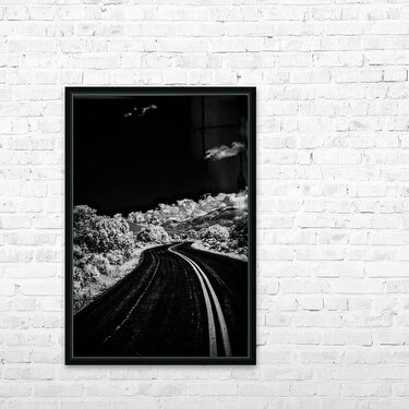 Symphony of Road and Foliage enchants with its magical interplay of light and shadow revealing an otherworldly journey. This infrared black and white