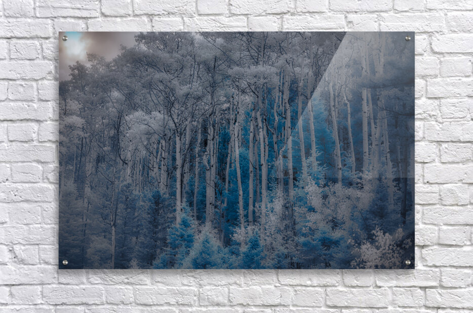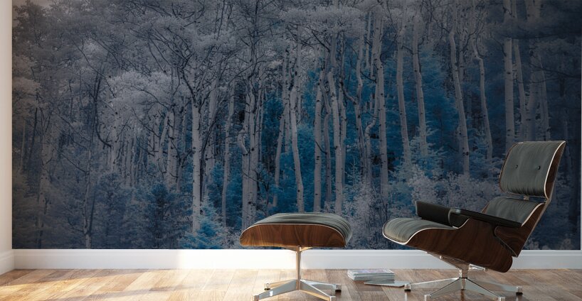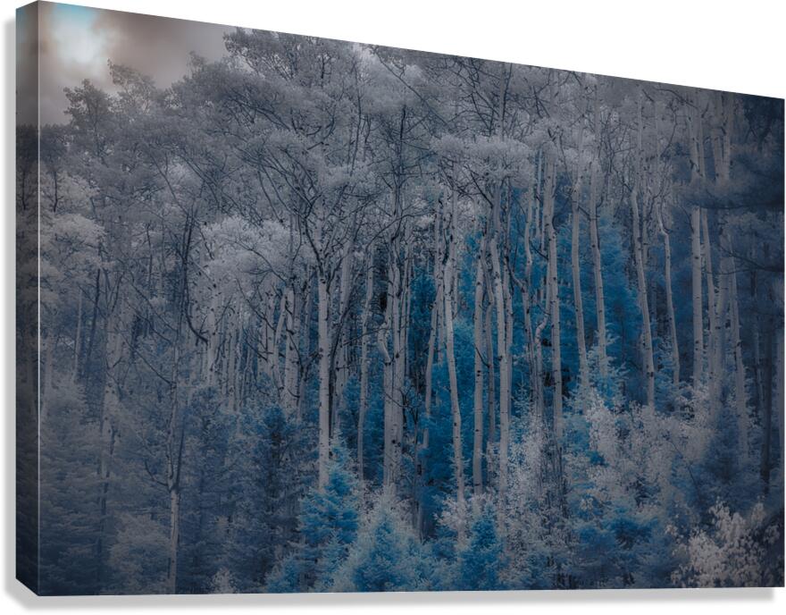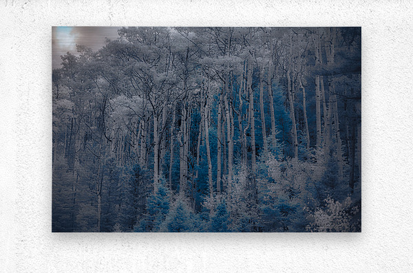 Ethereal Blue Amidst Monochrome Forest stands as a testament to the realm where reality seamlessly melds with fantasy. This infrared digital creation captures a forest immersed in serene monochromatic tones of white and grey. The towering slender trees assemble an intricate tapestry of branches and leaves enveloping the landscape in a muted otherworldly glow. Rendered with extraordinary precision the dense foliage forms compelling patterns that beckon the viewer to delve deeper into the heart of this mystical grovescape. Amidst the soft muted hues vibrant splashes of deep blue emerge sporadically invoking a sense of the divine and the ethereal. These azure accents contrast vividly against the restrained palette infusing the scene with an aura of mystery and tranquility. The interplay between light and shadow further imbues this majestic forest with a dreamlike quality inviting contemplation and sparking the imagination. Enveloped in an atmosphere of quiet introspection the artwork conveys a sense of calm and otherworldly peace. The juxtaposition of the grayscale landscape with the surreal blue highlights evokes a delicate balance between the known and the unknown the mundane and the magical. This enchanting forest scape serves as both a refuge and a portal transporting the observer to an entrancing world where the boundaries of reality subtly dissolve.