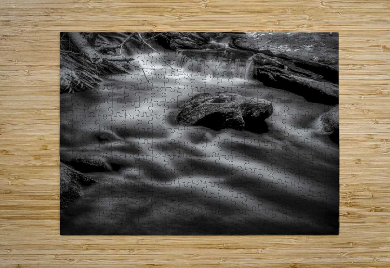 Immerse yourself in the ethereal beauty of Flowing Elegance a spellbinding black and white photograph capturing the graceful dance of water as it cascades and swirls with mesmerizing fluidity. The long exposure technique used in this piece brings a sense of movement and tranquility transforming the water into a delicate flowing veil that seems to transcend time itself. Solid rocks stand as silent witnesses their sharp edges contrasting starkly against the soft serene flow of water. This captivating artwork invites you to lose yourself in the interplay of light and shadow in the intricate patterns and textures that unfold before your eyes. Let the timeless beauty of nature envelop you in its embrace and experience a moment of pure unadulterated serenity.