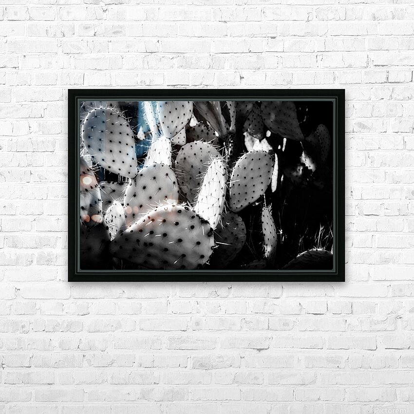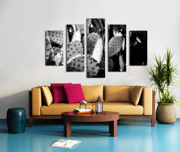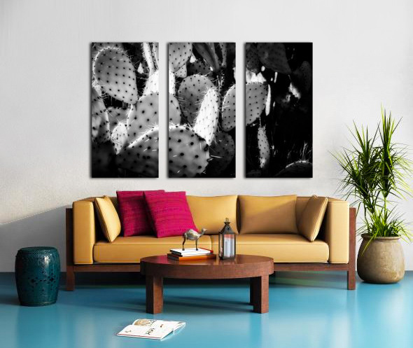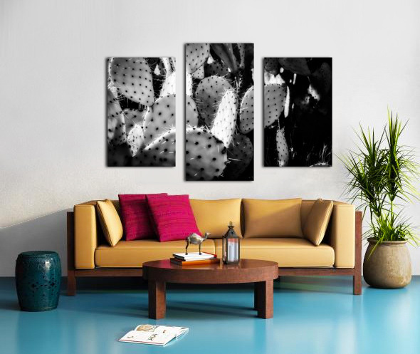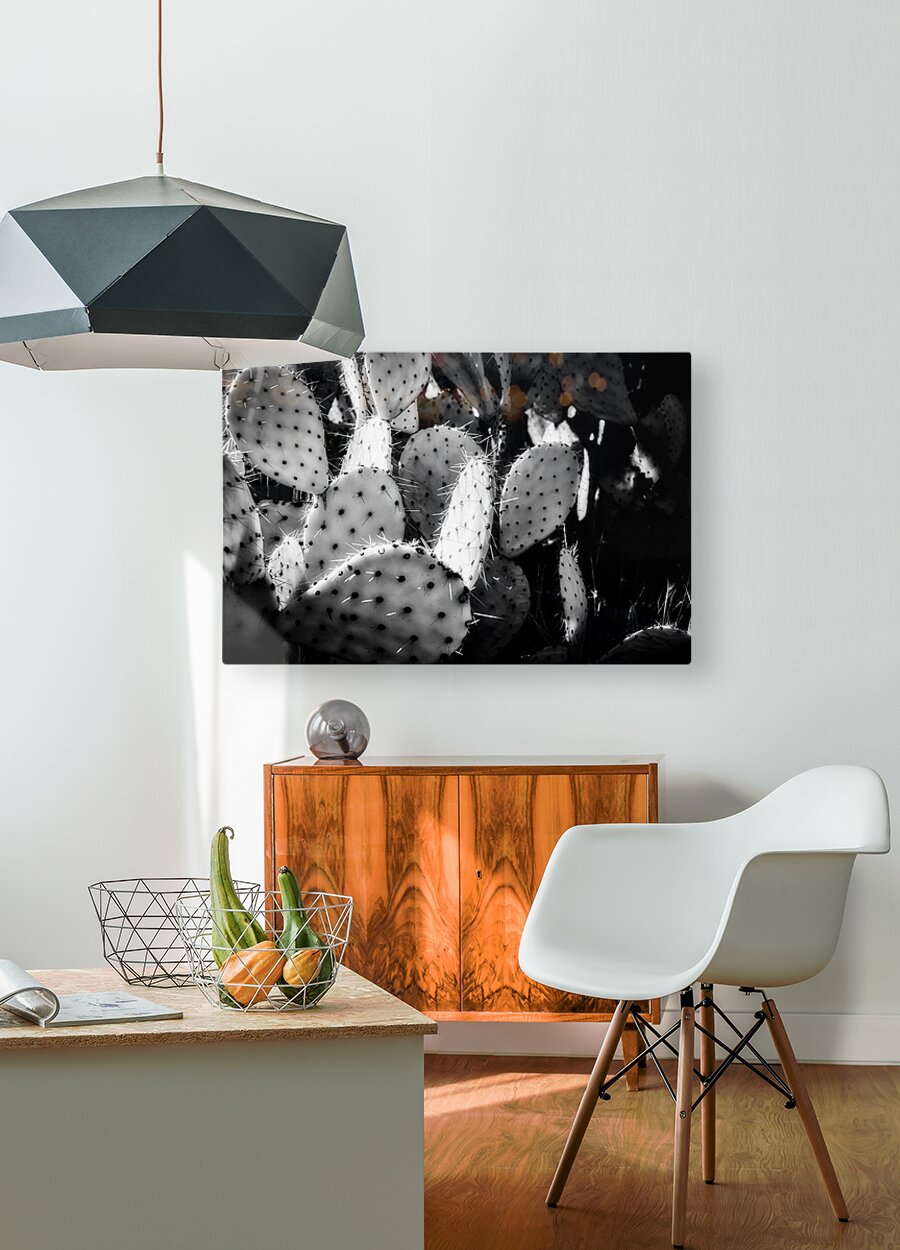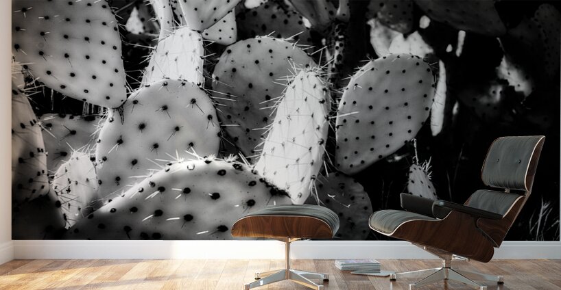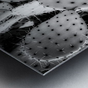 Embark on a journey through an enigmatic landscape where shadows dance delicately across the ancient forms of prickly pear cactus pads. This black and