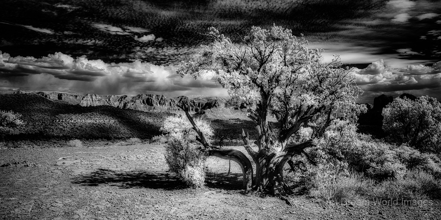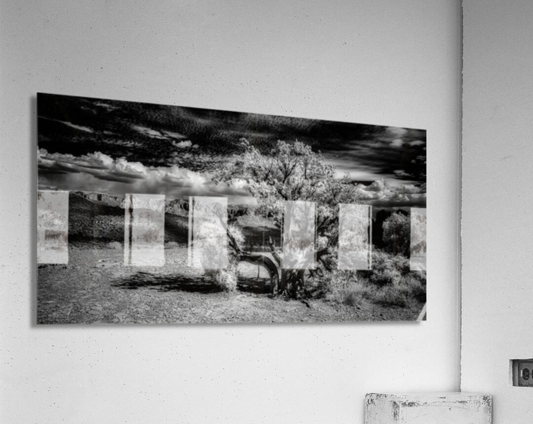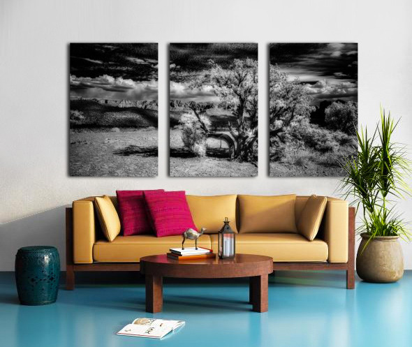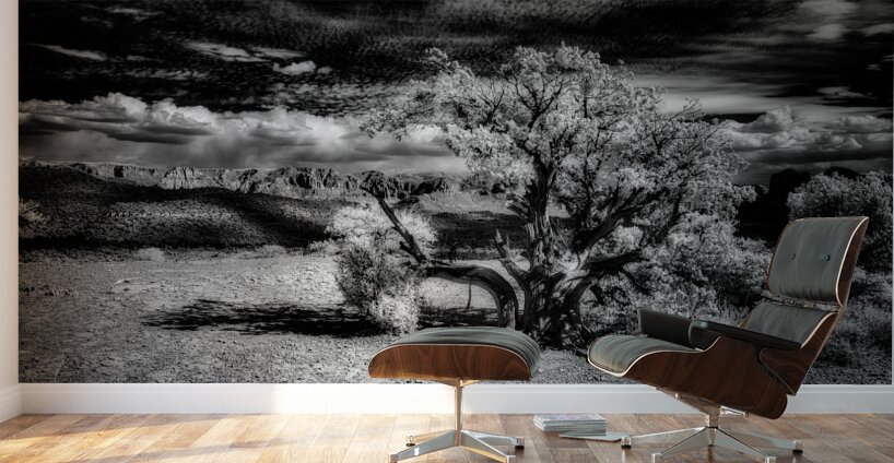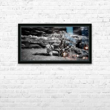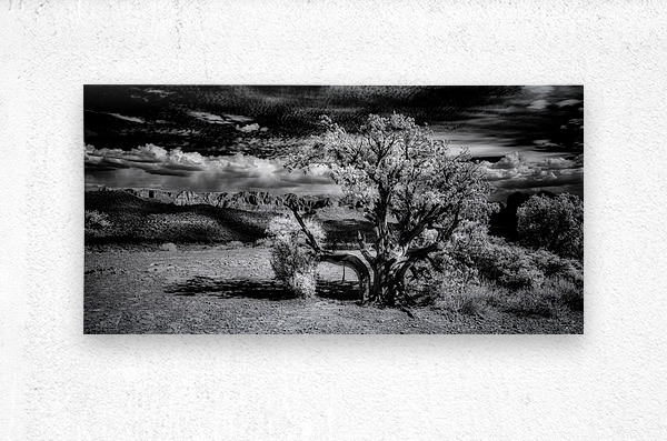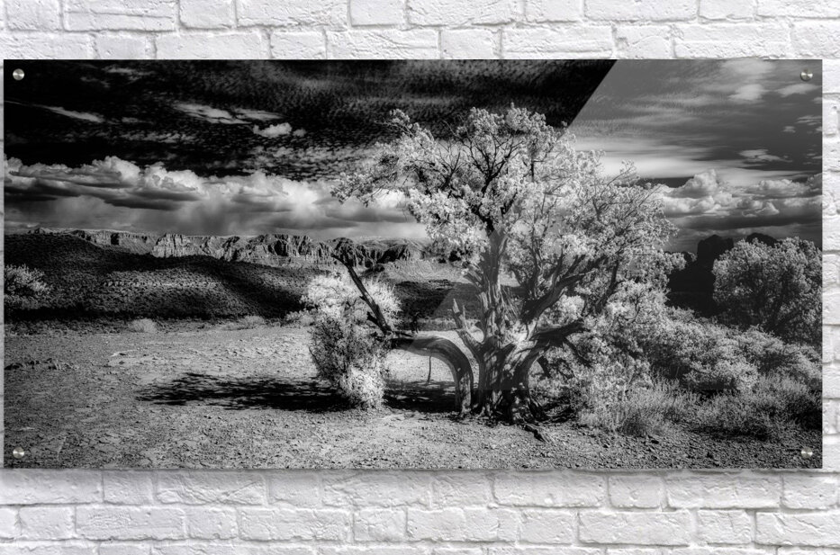 Bark and Cloud: A Monochrome Dialogue invites the viewer into a realm where time seems to stand still. In the stark contrast between shadow and light a solitary gnarled tree emerges as the protagonist of this enigmatic landscape. Positioned in a barren desert the tree stands as a testament to resilience its twisted branches reaching skyward in a silent conversation with the endless expanse above. The black and white photograph transforms the ordinary into the extraordinary casting the scene in a palette of timelessness that draws attention to the intricate details of the trees textured bark and the arid ground beneath it. The sky with its dramatic clouds acts as a celestial canvas—a tapestry of mystery and grandeur that sets the stage for the dialogue between earth and the heavens. This artwork captures the essence of solitude and strength whispering stories of endurance and beauty in a harsh yet hauntingly beautiful environment. With every glance the piece evokes a sense of profound contemplation inviting the onlooker to find their own story within its monochrome depths.