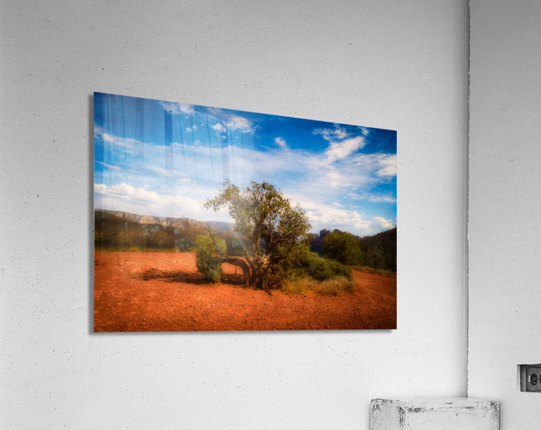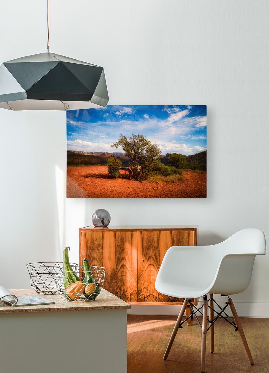 Traverse into the mystical realm of Gnarled Ode on Reddish Earth where natures raw grandeur unfolds in a scene steeped in otherworldly allure. Within this captivating photograph a lone tree ancient and wizened casts its gnarled silhouette against the vast canvas of a vivid blue sky. The twisted branches with their sparse foliage stand as testament to resilience in the face of times inexorable passage rooted firmly in earth of a rich reddish hue. The landscape stretches beyond the immediate drawing the eye to distant mountains that stand vigil over a slightly rugged terrain. A tapestry of deep colors and intricate textures blend seamlessly where the barren ground contrasts with the lively ethereal expanse above. Scattered clouds drift like whispered secrets across the azure firmament enhancing the sense of isolation and majesty. This composition a dance of contrasts and harmonies entices the soul to ponder the enigmatic beauty of untamed wilderness. It invites viewers to lose themselves in an exploration of beauty that is both stark and sublime unfolding stories etched in the earthly and celestial tones of the photographs landscape.