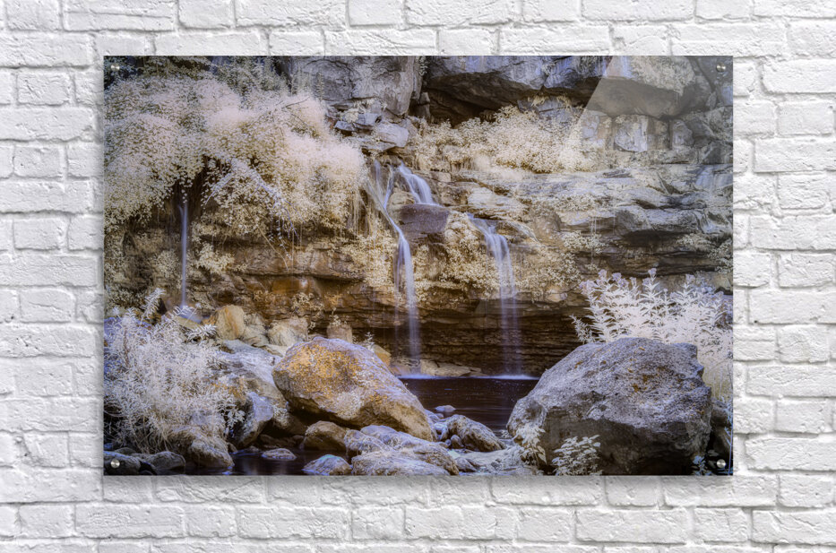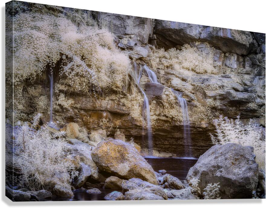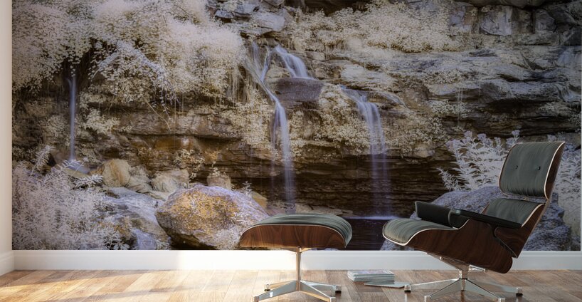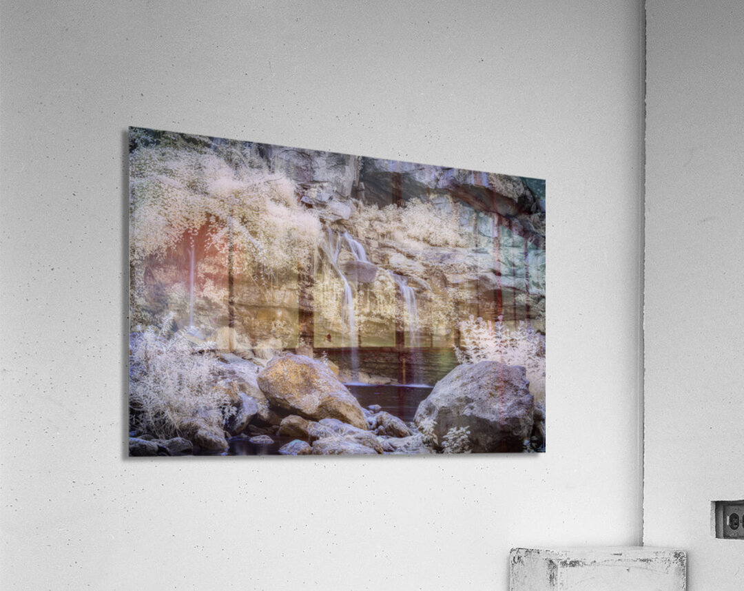 Untouched Serenity in Infrared transports the observer to a realm where natures seclusion is exalted through ethereal beauty. The scene unfolds with a gentle waterfall descending gracefully over time-worn rocky outcrops its waters whispering secrets of a forgotten world. Below a tranquil pool mirrors the serenity above inviting contemplation and solace. Surrounding the cascade foliage clings tenaciously to steep rock faces a verdant testament to the untamed spirit of the wilderness. The air is thick with mist an otherworldly veil that softens the light and imbues the landscape with a spectral glow making reality bend towards the fantastical. Textures emerge vividly throughout—each rock each leaf meticulously rendered in exquisite detail. This creation draws upon the unseen spectrum of infrared rendering the familiar in an unfamiliar almost dream-like hue. It is a capture of elemental beauty where the harmony of untouched nature and the magical spectrum weave a tapestry of mystic allure. The essence of a secluded paradise is immortalized offering viewers the sublime experience of a world that feels both timeless and elusive.