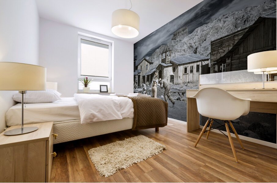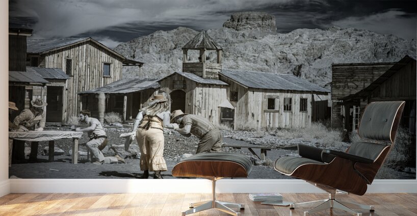Timeless Liveliness in a Desert Town is a mesmerizing photograph that transports viewers to a bygone era immersing them in a scene where history seems to breathe with vitality. This captivating artwork captures a moment in a quaint historic Old West-style town where the essence of a lost time comes alive through meticulously preserved wooden edifices. These rustic structures weathered yet resilient stand against an awe-inspiring backdrop of rugged mountainous terrain their presence echoing untold stories whispered by the winds. In the foreground an ethereal ballet unfolds as figures in period-specific attire animate the town with their lively interactions. Cowboy hats tipped at a jaunty angle and vintage dresses that billow in an unseen breeze conjure the spirit of the Old West. Each figure plays a role in this vivid tableau a dance of shadows and light that echoes the trials and triumphs of forgotten lifetimes. The photographs dramatic and desaturated color palette casts a spell of nostalgia enveloping viewers in an antique atmosphere where the past and present intertwine in a mystic embrace. This piece invites its audience to explore the deeper mysteries of time and memory encouraging a reflection on the rhythms of life that persist through epochs both seen and unseen. With its enigmatic allure the photograph compels a closer examination of the spaces between the palpable and the ephemeral urging a contemplation of the timeless dance of liveliness in a realm seemingly untouched by the hands of modernity.