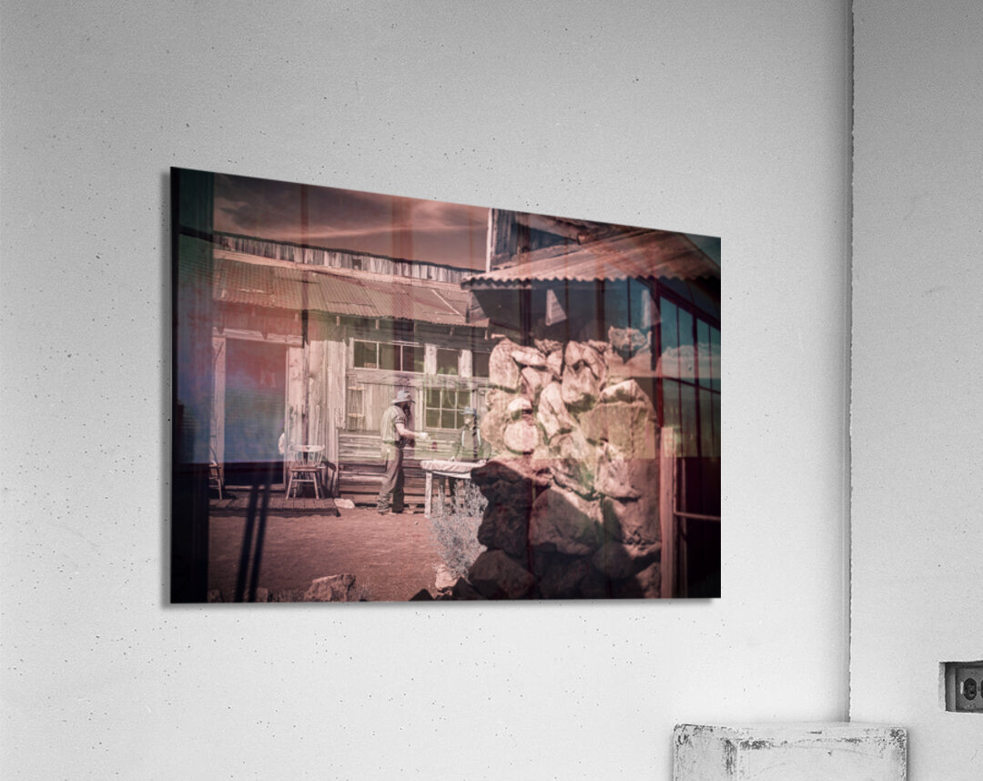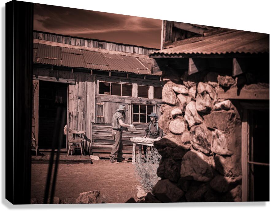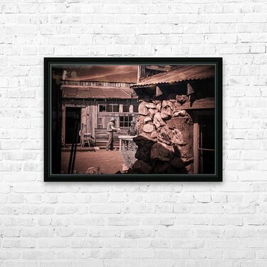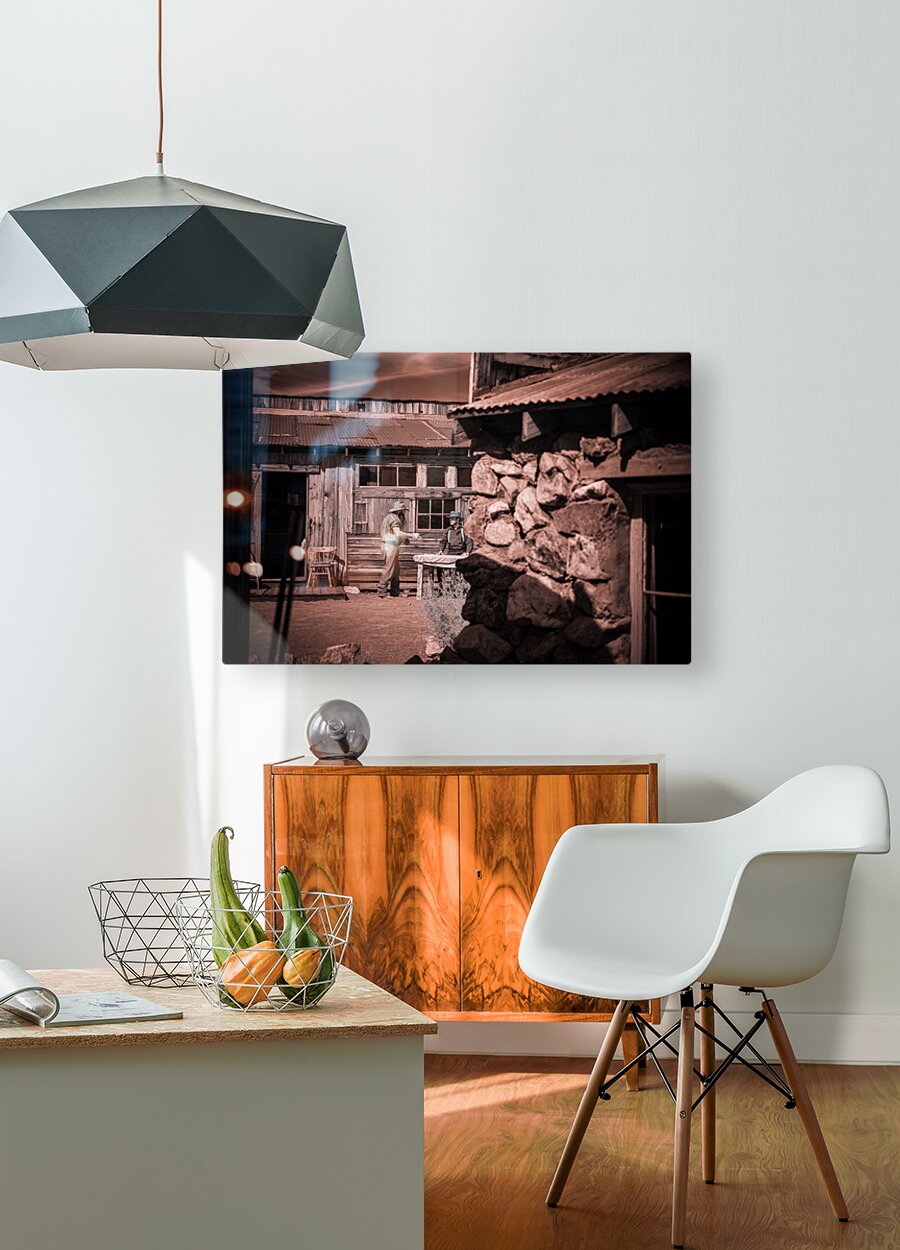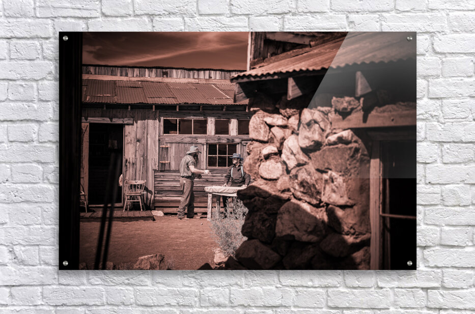 In a realm where time blurs and whispers of the past echo this sepia-toned creation emerges as a portal to another era. Conversation of Textures conjures up a rustic historical scene where two souls draped in garments of long-gone days converge in silent dialogue before a storied sanctuary. The weathered wooden building draped in history and dust stands sentinel with its corrugated metal roofs casting shadows that dance in the waning light. Intricate stonework lies in repose at the forefront whispering tales of rugged lands and the hands that shaped them each crevice and contour telling its own story. This image weaves a tapestry woven from threads of time capturing a fleeting moment of existence within an old western vista. The delicate interplay of textures and contrasts within the photograph is masterfully poised to draw the eye and spirit into contemplation. It is a mirror reflecting back to us a distant era inviting the viewer to walk amidst the echoes of its inhabitants to feel the fabric of their lives through every detail captured. Inspiration like a gentle gust of wind swept across the landscape of imagination to birth this piece channeling the soul of bygone times into present form. The process itself was marked by a unique alchemy of vision and technique a conjuring act that distills essence from shadow and light. As the viewer steps into this world each element beckons—textures of wood and stone fabric and earth—enticing with an enigmatic allure that transcends mere image breathing life back into the chronicles of forgotten tales.