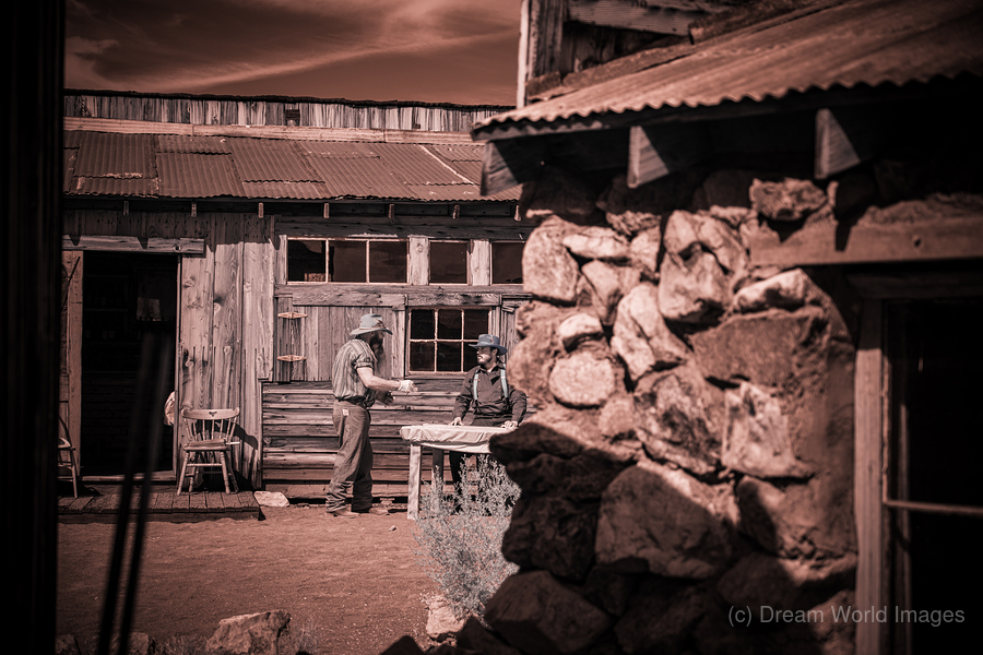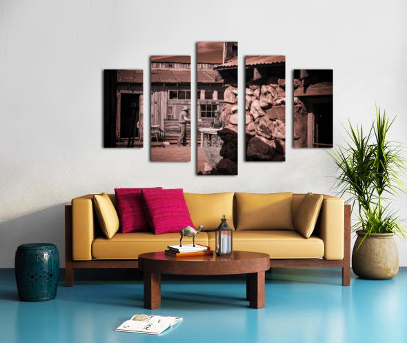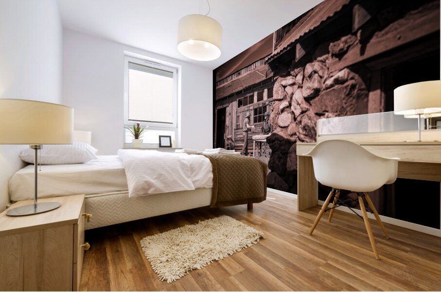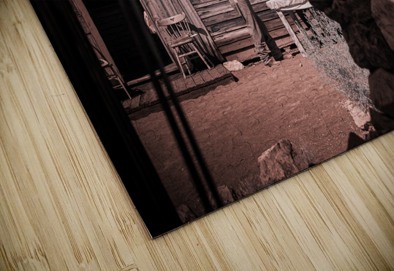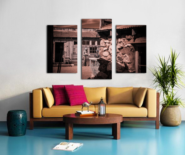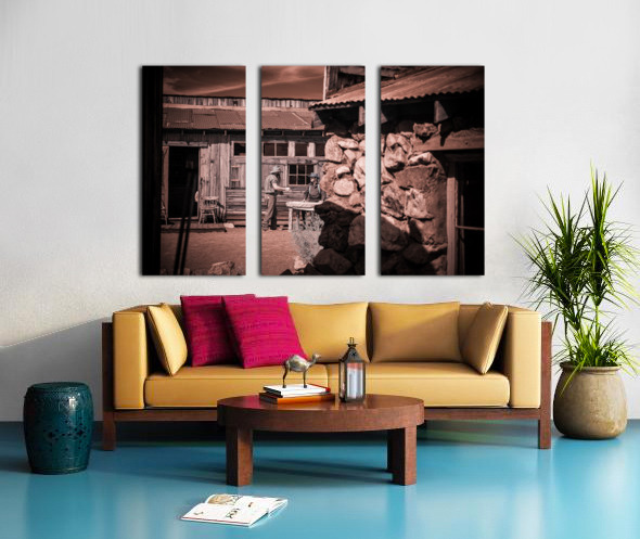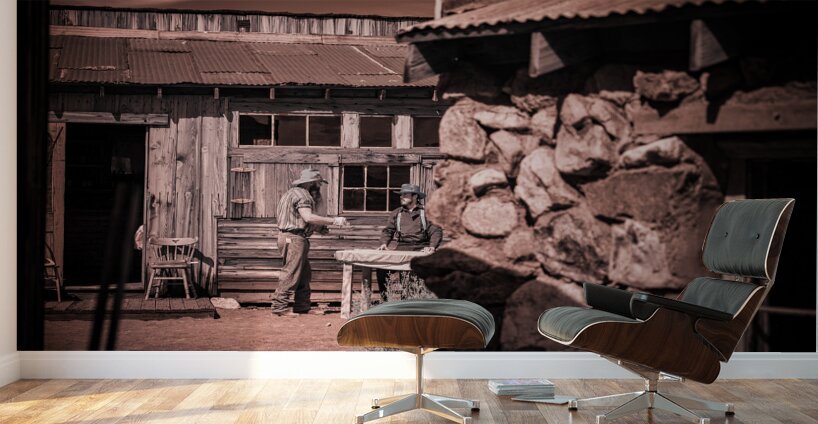 In a realm where time blurs and whispers of the past echo this sepia-toned creation emerges as a portal to another era. Conversation of Textures conjures up a rustic historical scene where two souls draped in garments of long-gone days converge in silent dialogue before a storied sanctuary. The weathered wooden building draped in history and dust stands sentinel with its corrugated metal roofs casting shadows that dance in the waning light. Intricate stonework lies in repose at the forefront whispering tales of rugged lands and the hands that shaped them each crevice and contour telling its own story. This image weaves a tapestry woven from threads of time capturing a fleeting moment of existence within an old western vista. The delicate interplay of textures and contrasts within the photograph is masterfully poised to draw the eye and spirit into contemplation. It is a mirror reflecting back to us a distant era inviting the viewer to walk amidst the echoes of its inhabitants to feel the fabric of their lives through every detail captured. Inspiration like a gentle gust of wind swept across the landscape of imagination to birth this piece channeling the soul of bygone times into present form. The process itself was marked by a unique alchemy of vision and technique a conjuring act that distills essence from shadow and light. As the viewer steps into this world each element beckons—textures of wood and stone fabric and earth—enticing with an enigmatic allure that transcends mere image breathing life back into the chronicles of forgotten tales.