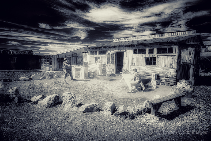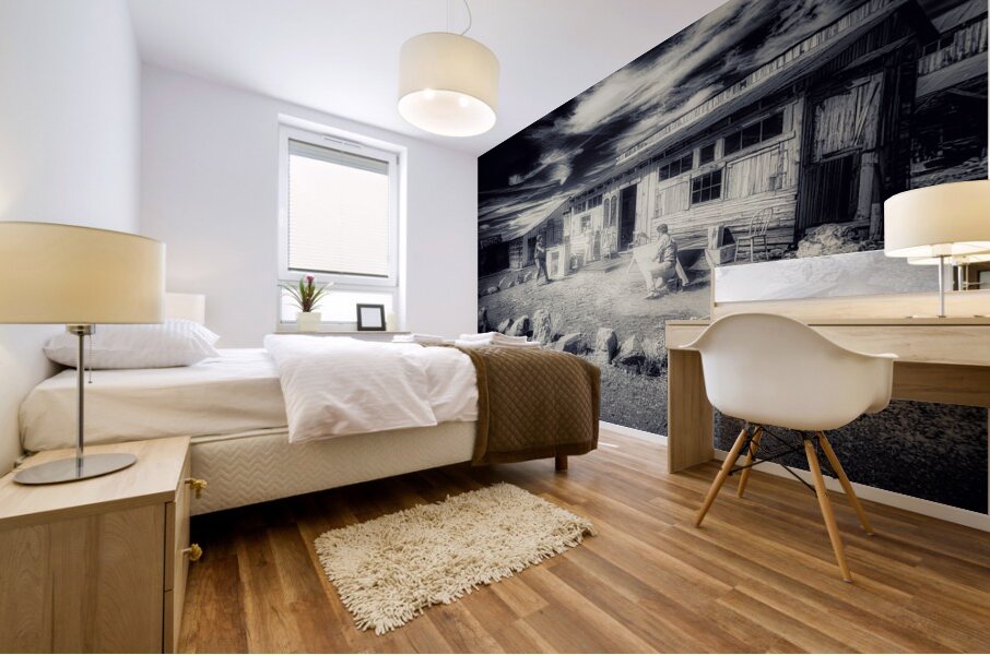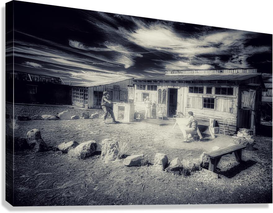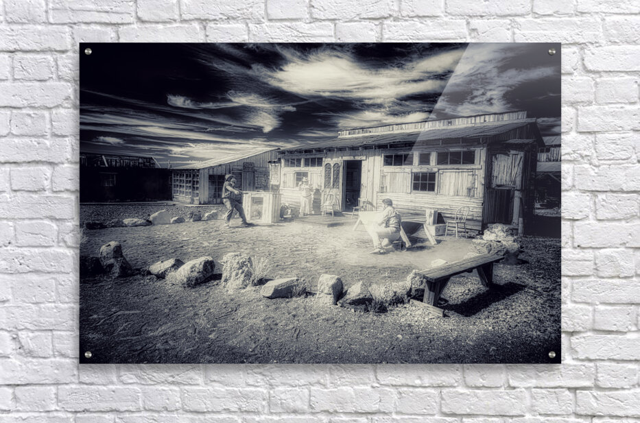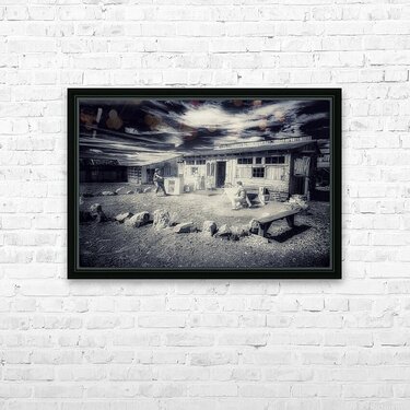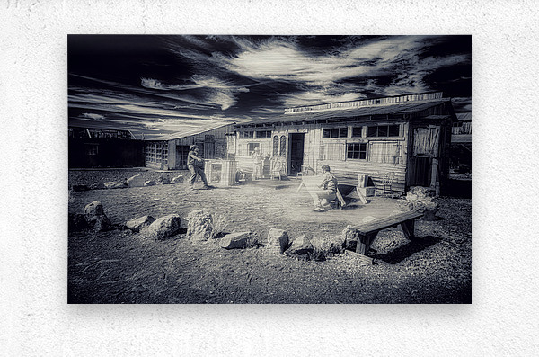 Step into a world where time seems to pause, captured within the gentle chaos of swirling skies and whispered stories etched in wood. "Whirlwinds of Time and Texture" invites you to behold a scene both familiar and surreal. Here, a rustic wooden building, resolute in its solitary abode, stands against the vast silence of a desert landscape. Each timber tells a tale, its weathered surfaces speaking of endurance and forgotten epochs. In the foreground, a lone figure sits in quiet contemplation, absorbed in the mysteries of a newspaper—an emblem of serene introspection amid the undisturbed rhythm of daily life. Surrounding them, others engage in the mundane yet profound rituals that stitch together the fabric of existence, rendering the scene both intimate and universal. The skies above are alive with movement, as if revealing a celestial dance reserved for those willing to look beyond the ordinary. Swirls of clouds twist and stretch, painting an ever-changing tapestry that contrasts with the stillness below. This monochromatic world quivers with textural richness; light and shadow play across surfaces, carving out layers of nostalgia and giving form to the unseen. Imbued with a sense of mystery and temporal fluidity, this black and white photograph does more than capture a moment; it conjures a timeless dimension where the echoes of past and present entwine, inviting the viewer to lose themselves in its enigmatic embrace.