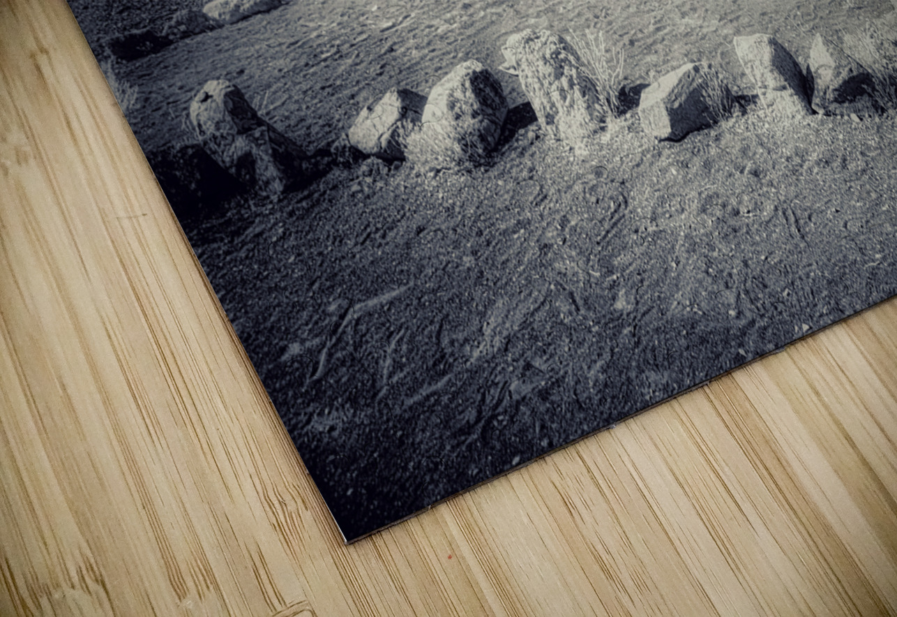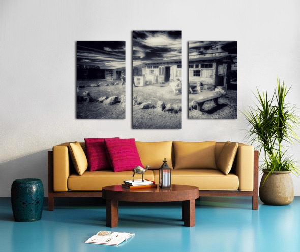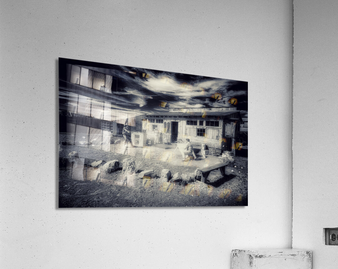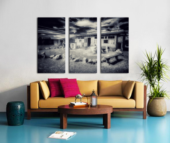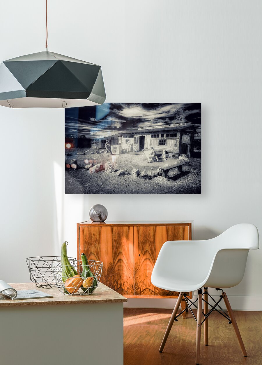 Step into a world where time seems to pause, captured within the gentle chaos of swirling skies and whispered stories etched in wood. "Whirlwinds of Time and Texture" invites you to behold a scene both familiar and surreal. Here, a rustic wooden building, resolute in its solitary abode, stands against the vast silence of a desert landscape. Each timber tells a tale, its weathered surfaces speaking of endurance and forgotten epochs. In the foreground, a lone figure sits in quiet contemplation, absorbed in the mysteries of a newspaper—an emblem of serene introspection amid the undisturbed rhythm of daily life. Surrounding them, others engage in the mundane yet profound rituals that stitch together the fabric of existence, rendering the scene both intimate and universal. The skies above are alive with movement, as if revealing a celestial dance reserved for those willing to look beyond the ordinary. Swirls of clouds twist and stretch, painting an ever-changing tapestry that contrasts with the stillness below. This monochromatic world quivers with textural richness; light and shadow play across surfaces, carving out layers of nostalgia and giving form to the unseen. Imbued with a sense of mystery and temporal fluidity, this black and white photograph does more than capture a moment; it conjures a timeless dimension where the echoes of past and present entwine, inviting the viewer to lose themselves in its enigmatic embrace.