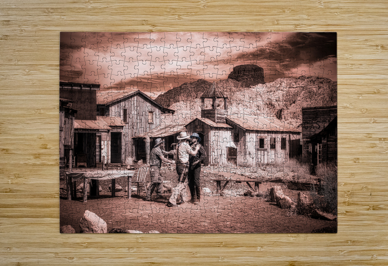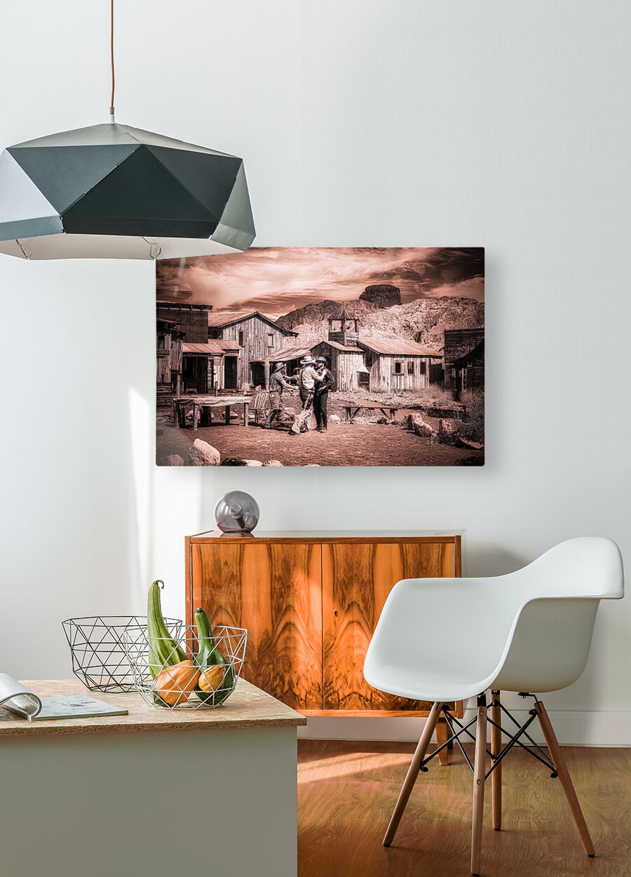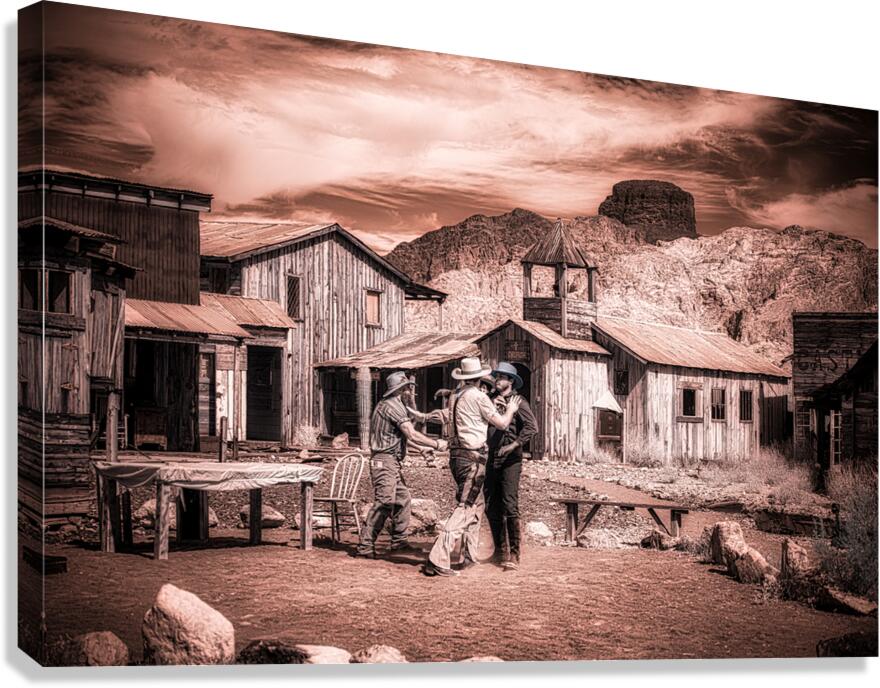 Step into the enigmatic world of Sepia Dreams of Rustic Encounters where times whisperings unravel the tapestry of the Old West. This evocative sepia-toned photograph captures a fleeting moment of camaraderie among three figures each donned in timeless cowboy attire. They stand in a mirage of dusty streets and weathered wooden structures—a spectral echo of a bygone era that still sings amidst the mountains majestic guardians in the distance. The photograph with its ghostly patina beckons the viewer into a realm of historical reverie. Its sepia tones cast an alchemical spell transforming mere moments into mystic vignettes. The scene is alive with unwritten tales waiting to be whispered among the rugged wooden edifices that play host to these spectral travelers of yesteryears. As you drift deeper into this realm the work invites you to ponder the lives interwoven within this rustic tableau. It asks you to discover the stories concealed behind each smile beneath each shadow—stories etched in the sand and whispered by the wind. This artwork leaves an indelible impression summoning the spirit of Americana and capturing the souls yearning for the wild untamed frontier that once was and perhaps still might be somewhere in our sepia dreams.