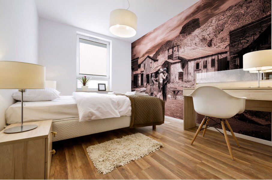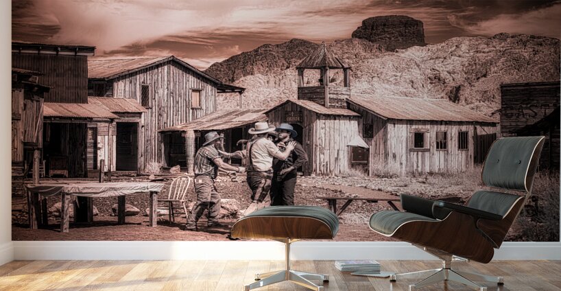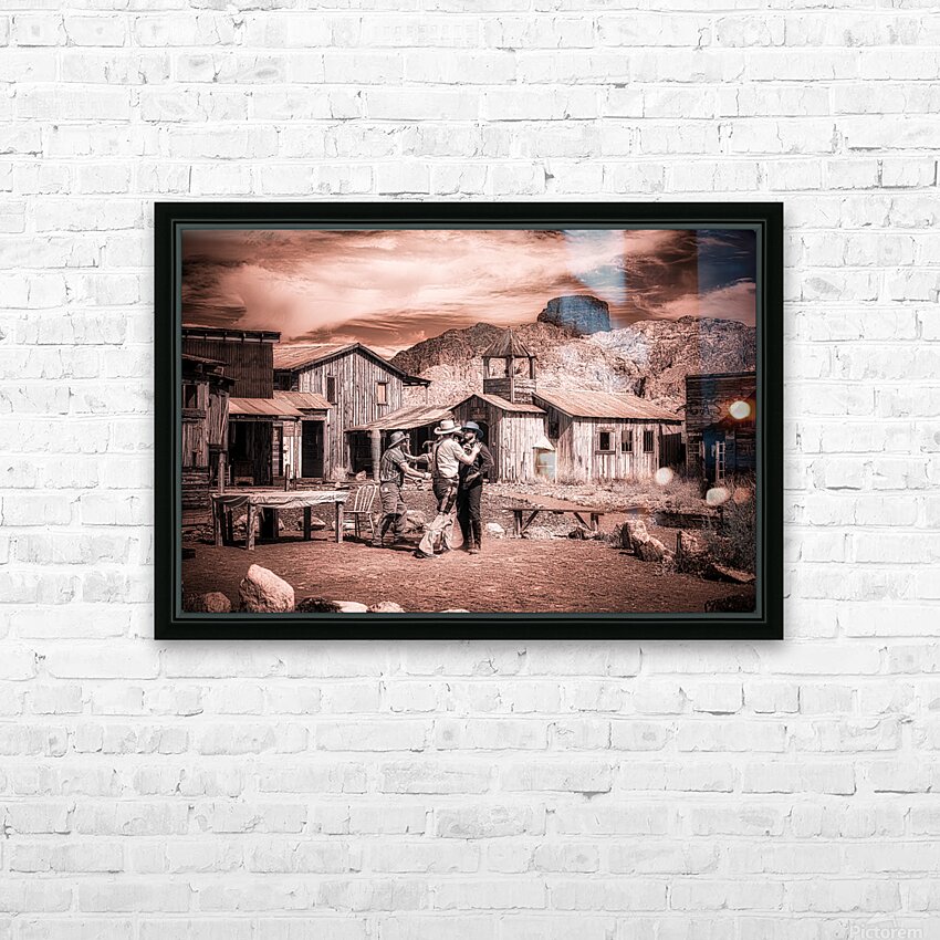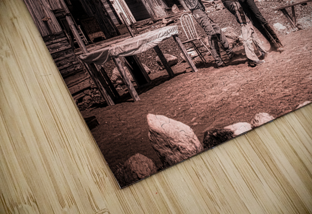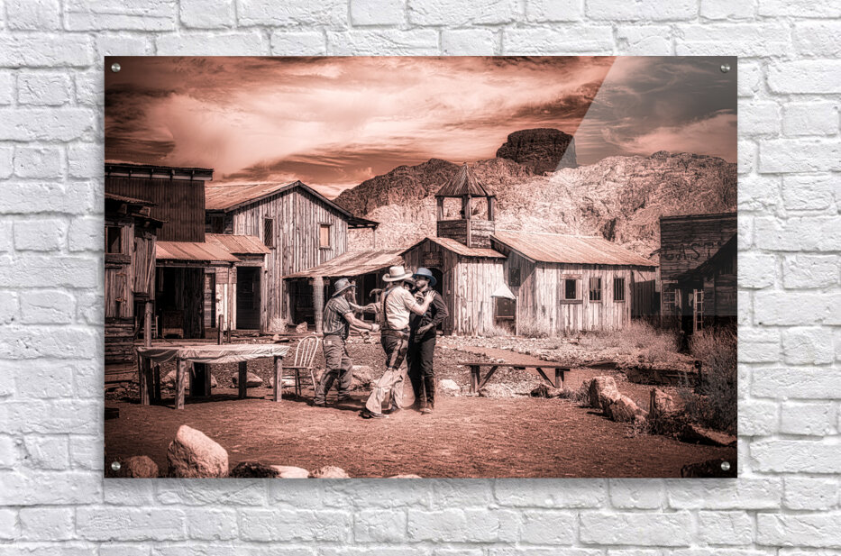 Step into the enigmatic world of Sepia Dreams of Rustic Encounters where times whisperings unravel the tapestry of the Old West. This evocative sepia-toned photograph captures a fleeting moment of camaraderie among three figures each donned in timeless cowboy attire. They stand in a mirage of dusty streets and weathered wooden structures—a spectral echo of a bygone era that still sings amidst the mountains majestic guardians in the distance. The photograph with its ghostly patina beckons the viewer into a realm of historical reverie. Its sepia tones cast an alchemical spell transforming mere moments into mystic vignettes. The scene is alive with unwritten tales waiting to be whispered among the rugged wooden edifices that play host to these spectral travelers of yesteryears. As you drift deeper into this realm the work invites you to ponder the lives interwoven within this rustic tableau. It asks you to discover the stories concealed behind each smile beneath each shadow—stories etched in the sand and whispered by the wind. This artwork leaves an indelible impression summoning the spirit of Americana and capturing the souls yearning for the wild untamed frontier that once was and perhaps still might be somewhere in our sepia dreams.