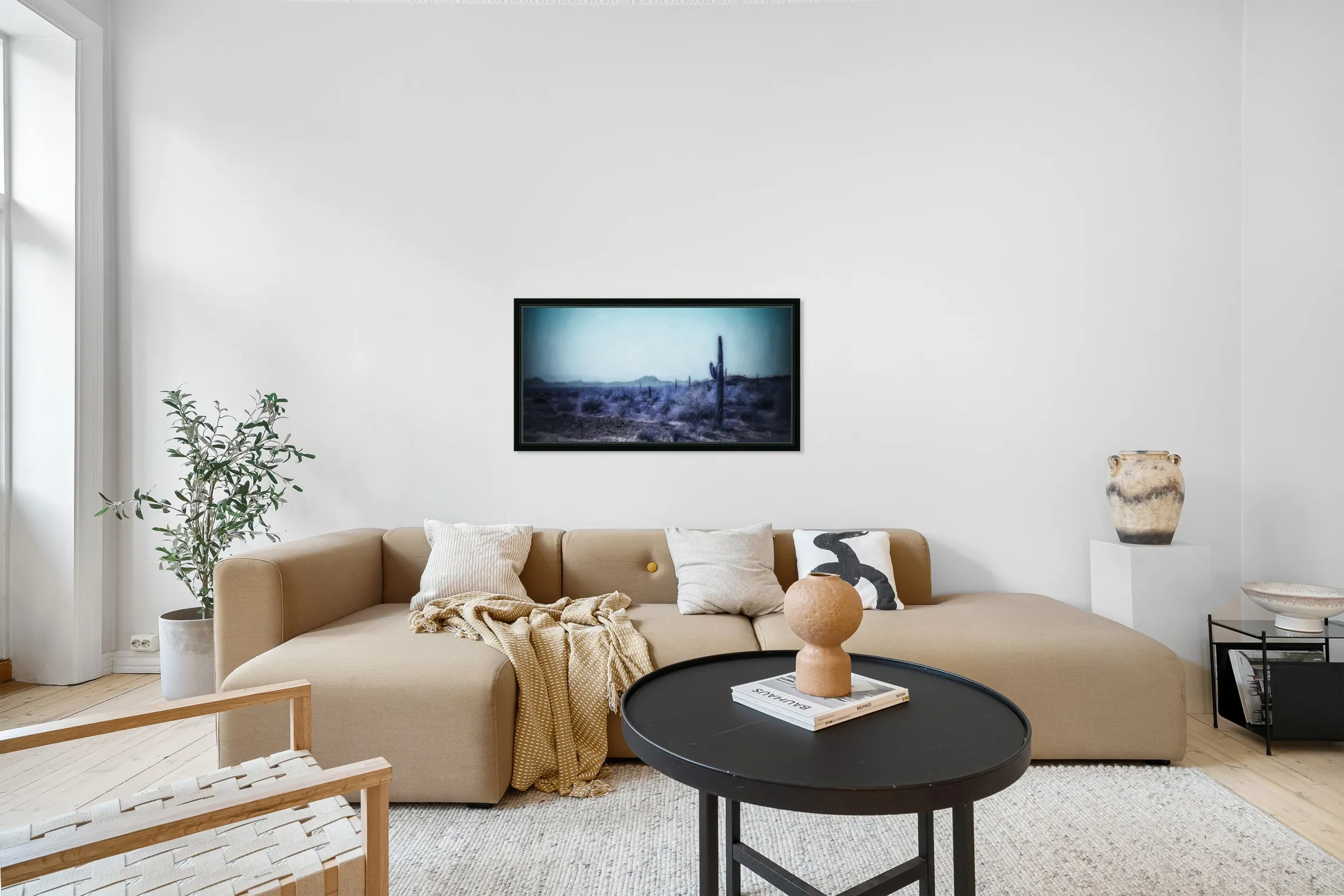 Ethereal Cactus Serenade invites the observer into a world where the natural and the surreal blend in a dance of enigmatic serenity. This ethereal realm is painted in rich cool hues of blue and purple crafted through the lens of infrared digital techniques. The artwork captures the vast tranquility of a desert landscape its focal point being the majestic saguaro cacti standing as sentinels amidst an endless expanse. The painting beckons you to pause and be immersed in its otherworldly atmosphere where the sharp outlines of the cacti seem almost to pierce the fabric of reality while the distant mountains and desert vegetation melt into a softer blurred tapestry. This contrast enhances the dreamlike texture creating a painterly effect that invites both wonder and contemplation. At the heart of Ethereal Cactus Serenade is an invitation to explore the mystical unknown where the boundaries of the visible transform into a serene abstraction. It embodies the silent whispers of the desert a serenade of colors and light that resonates with both the mind and spirit drawing one into the harmonious solitude of this uncharted desertscape.