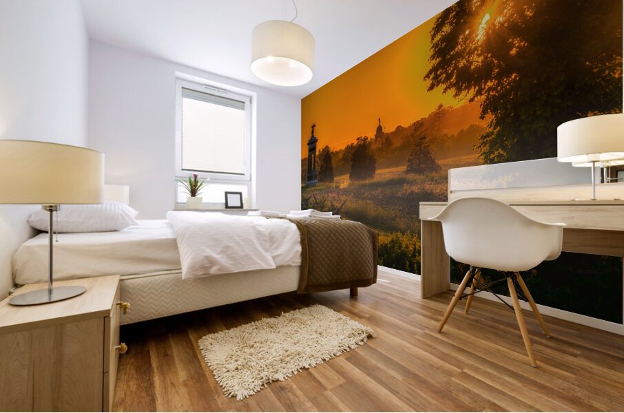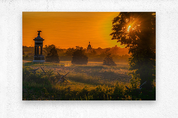 In the golden haze of dawn, Gettysburg's hallowed ground reveals its timeless story. A distant church steeple pierces the morning mist while sunbeams paint the battlefield in ethereal amber tones. This magical moment transforms the historic landscape into a meditation on sacrifice and peace, where nature's daily tribute bathes these sacred fields in reverent light. Part of the "Hallowed Dreams" collection, this image captures the delicate balance between remembrance and renewal on this hallowed soil.