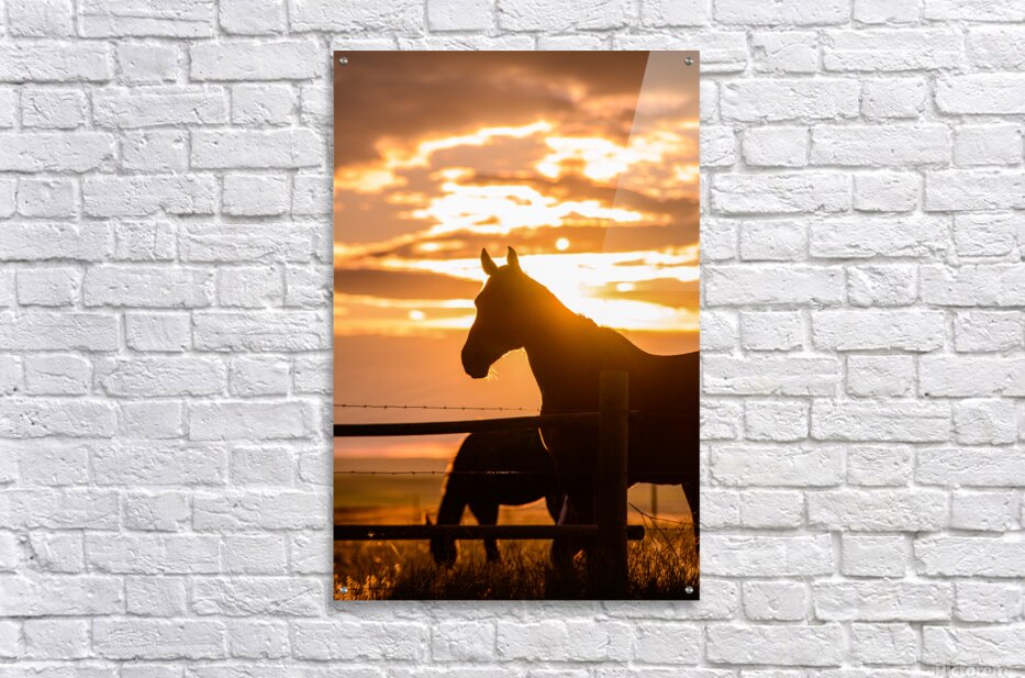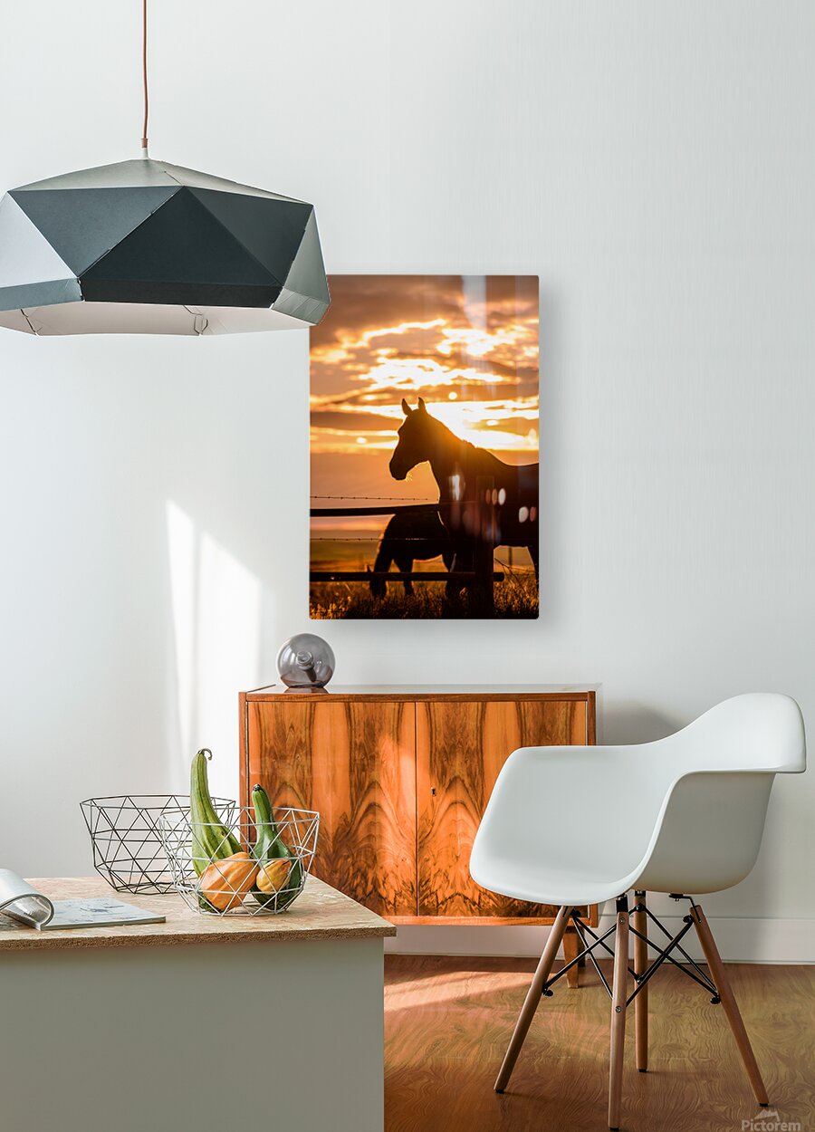 As the sun dips below the horizon casting its golden rays across the landscape a lone silhouette stands in quiet contemplation. Against a backdrop of swirling clouds and radiant hues of orange and yellow the majestic figure of a horse emerges bathed in the warm glow of dusk. Framed by a rustic fence of weathered wood and barbed wire the horse exudes a sense of grace and strength as if rooted in the timeless beauty of the natural world. The play of light and shadow creates a mystical aura around this enigmatic creature inviting the viewer to pause and ponder the mysteries of the twilight hour.  With a mane that seems to dance in the evening breeze the horse appears almost ethereal a symbol of freedom and untamed beauty. Its eyes reflecting the last remnants of daylight hold a depth of wisdom that seems to speak to the soul. The soft earthy tones of the landscape contrast with the vivid colors of the sky creating a mesmerizing scene that captures the essence of a tranquil evening in the countryside. In this moment of fleeting beauty the viewer is transported to a realm where tranquility and wonder reign supreme. The serenity of the scene is enhanced by the sounds of nature the rustling of leaves and the distant call of a bird adding layers of depth to the experience. The artist has masterfully captured the magic of twilight inviting viewers to immerse themselves in the quiet splendor of the natural world.