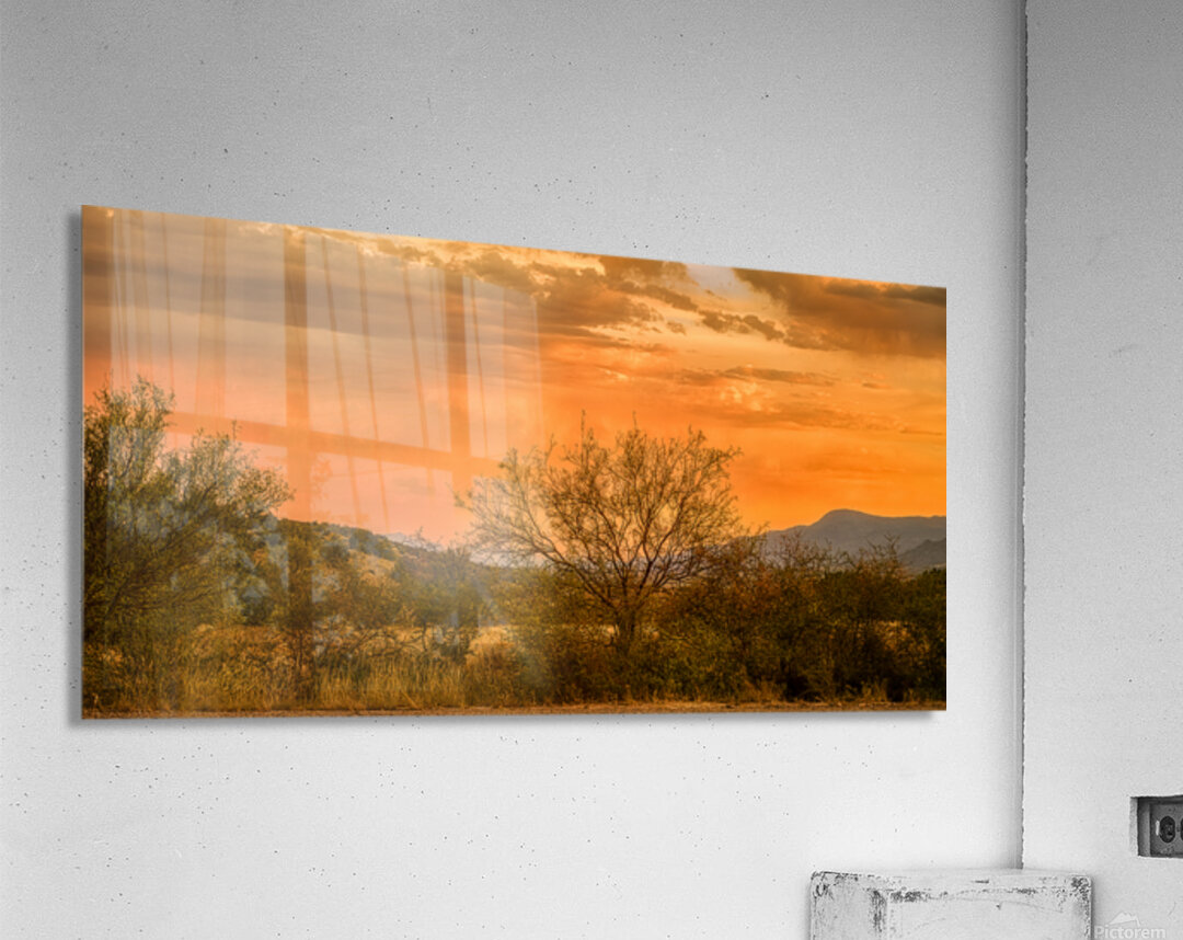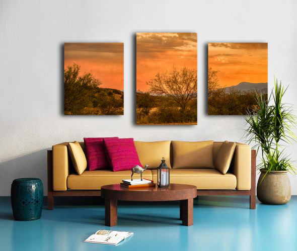 As my wife and I were driving back from the store in Cottonwood Arizona the sky started to light up in the most breathtaking way. We couldnt resist pulling over onto a dirt road to capture this moment. Behold a mesmerizing oasis of tranquility where time seems to linger in an eternal calm. This captivating photograph unveils a desert landscape bathed in the soft embrace of a setting sun. The sky above is a masterpiece of celestial artistry a gradient tapestry painted with enchanting hues of orange pink and blue. Wisps of clouds meander gently across the horizon whispering secrets carried by the dusk. In the foreground sparse desert vegetation subtly anchors the scene. A lone tree stands as a sentinel its silhouette etched against the vibrant twilight offering both contrast and harmony. The undulating contours of distant hills weave a gentle rhythm inviting the viewer to explore the vastness and depth of this serene sanctuary. As day gracefully yields to night this image captures not just the play of light and shadow but the essence of a landscape at peace with itself—a moment when natures serenity speaks to the soul unveiling mysteries often overlooked. Allow yourself to be drawn into this enigmatic dance of colors an experience as ephemeral as the desert breeze yet as enduring as the whispers of the dunes.