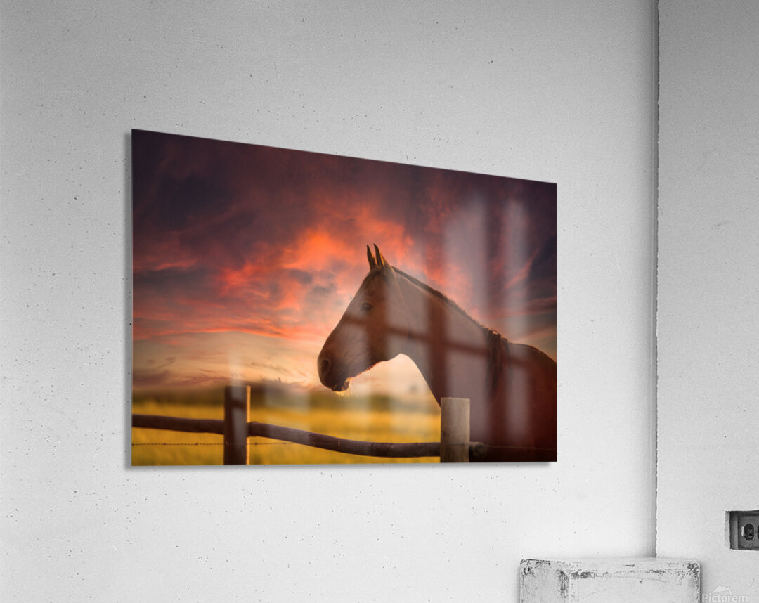 During our stay on a small ranch in Eastern Montana we encountered a few horses. One of them in particular caught my eye. He had a gentle demeanor that seemed to match his appearance perfectly. I couldnt shake the feeling that his name should be Ernie it just seemed to fit him so well. Ernie was cool and very inquisitive as I wandered around the ranch. One evening as the sun began to set I found myself drawn to Ernie once again. I couldnt resist capturing a shot of him against the backdrop of the stunning countryside. This photograph which I affectionately call Dreams Beyond the Fence is a mesmerizing piece of horse photography that seamlessly blends into the serene landscape. In this captivating artwork Ernie stands gracefully behind a weathered fence his noble presence drawing the viewers gaze toward the distant horizon. The vibrant sky painted in hues of orange pink and purple adds depth and dimension to the scene transforming it into a vibrant sky painting that evokes a sense of peace and wonder. Dreams Beyond the Fence beautifully captures the essence of nature and tranquility making it a perfect addition to any collection of serene nature artwork. It serves as a poignant reminder to dream beyond limitations and embrace the beauty surrounding us daily. With its exquisite portrayal of the countryside landscape and vibrant sky this photograph of Ernie will inspire and captivate all who behold it.