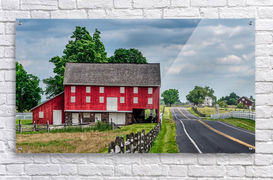 Capturing the essence of rural charm behold the iconic Sherfy red barn against a picturesque backdrop in Gettysburg Pennsylvania. This striking photog