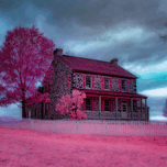 The historic Rose Farm at Gettysburg transforms through infrared photography its stone walls and picket fence bathed in surreal pink hues against a mo...[+]