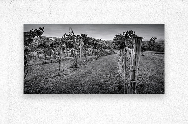 Extra wire hanging on a fence post in a vineyard.