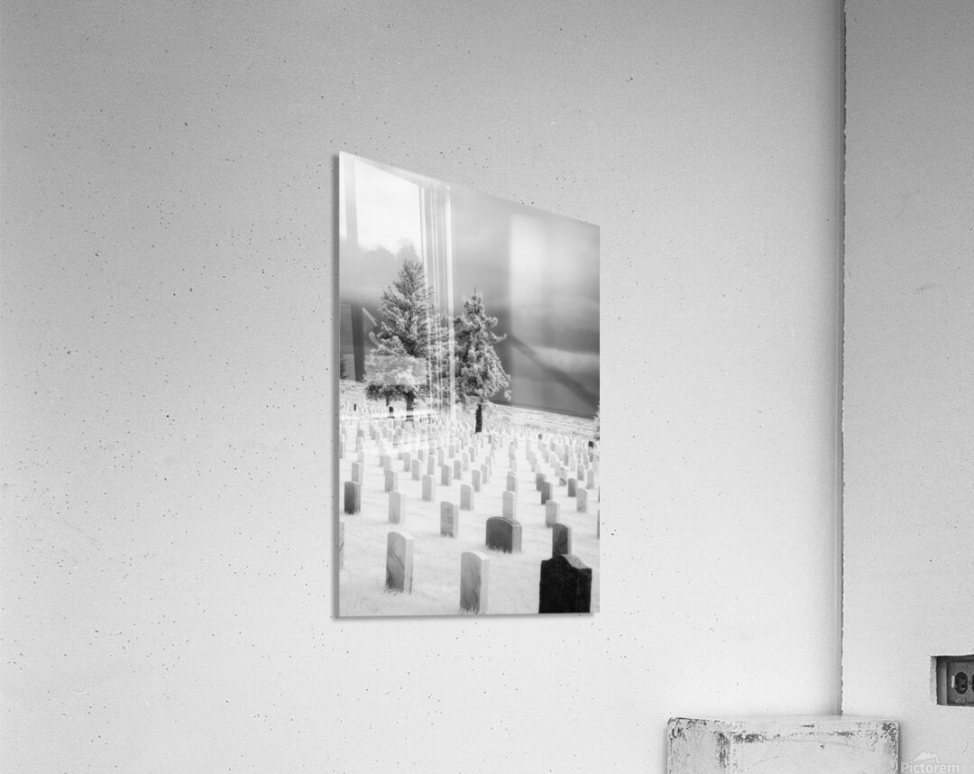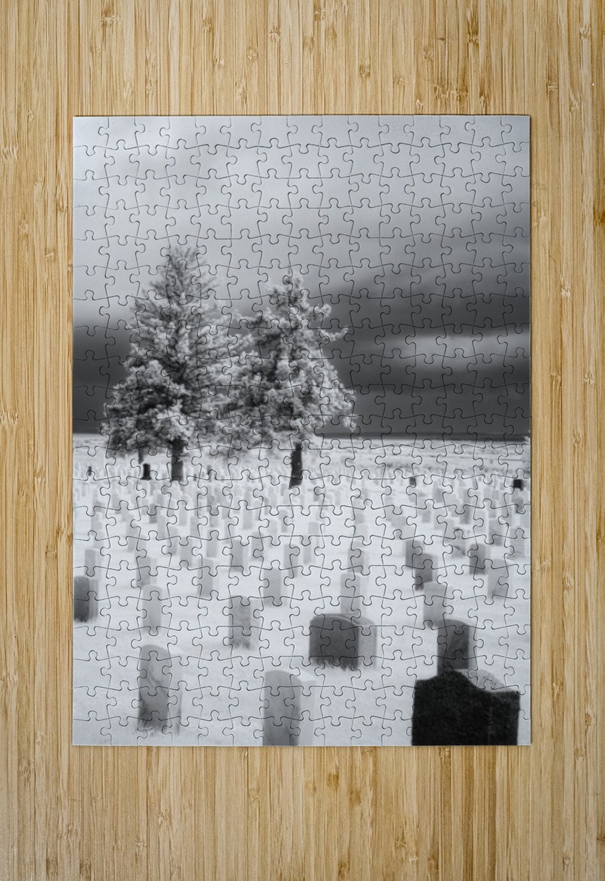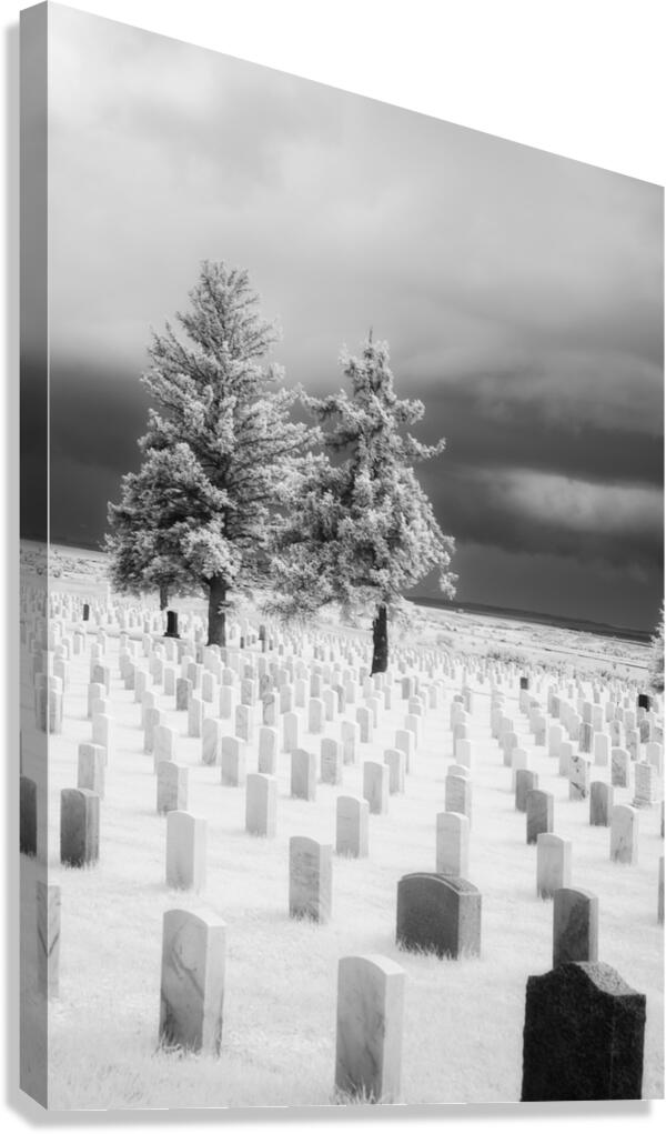As my wife Cooper and I traversed the historic grounds of the Little Bighorn Battlefield the weight of history pressed upon us. The solemn echoes of the past whispered through the air as raindrops fell steadily cloaking the landscape in a somber shroud. Amidst this poignant scene a black and white infrared image titled Guardians of Valor emerged capturing the essence of the battlefields cemetery. Rows of headstones most rendered in a ghostly white by the infrared lens stretched before us. A single headstone deep black against the pale backdrop stood prominently in the foreground—a poignant reminder of the lives lost in the tumultuous events of the past. Two stoic pine trees guardians of valor framed the scene their branches reaching skyward like silent sentinels. The stormy moody sky above mirrored the complex emotions stirred by the historical significance of the site. Raindrops both from the present and the past mingled in a melancholic dance casting an ethereal glow over the sacred resting place. Our visit to the Little Bighorn Battlefield was not just a journey through time it was an emotional exploration of sacrifice and remembrance. Guardians of Valor encapsulates that experience—a visual testament to the enduring spirits and stories etched into the very fabric of this hallowed ground.