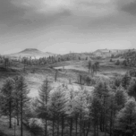 Embarking on a scenic journey along the wildlife loop at Custer State Park in South Dakota I immersed myself in a serene landscape and tranquil grandeur. Little did I know that my journey would lead me to capture a photograph that would encapsulate the timeless allure of the American wilderness. The image unfolded before me like a silent symphony—a monochrome masterpiece that captured the essence of the rolling hills and forested expanses that stretched out before me. Layered with depth and dimension the composition drew me in inviting me to explore the hidden secrets of the natural world. In the foreground dark silhouettes of conifer trees reminiscent of mighty pines stood tall and proud adding a sense of depth and three-dimensional quality to the scene. As my gaze traversed towards the middle ground the density of the trees gradually decreased creating a visual pathway through the hills dotted with sporadic clusters of trees and fallen trunks scattered across the slopes. In the background the gentle slopes of the hills melted into the horizon their contours softly outlined in the distance creating a hazy atmosphere that exuded a sense of vastness and tranquility. The overcast sky with clouds blending into the upper portion of the image hinted at the passage of a storm or the quiet aftermath of natures fury. The absence of color focused my attention on the intricate forms textures and contrasts within the landscape highlighting the raw beauty of the wilderness. As I beheld the scene before me I couldnt help but feel a sense of reflection and introspection wash over me as if the landscape itself held secrets waiting to be discovered. Capturing the essence of the wilderness in that fleeting moment I knew that the memory of this serene landscape would stay with me forever a testament to the timeless beauty and quiet resilience of natures untamed splendor.
