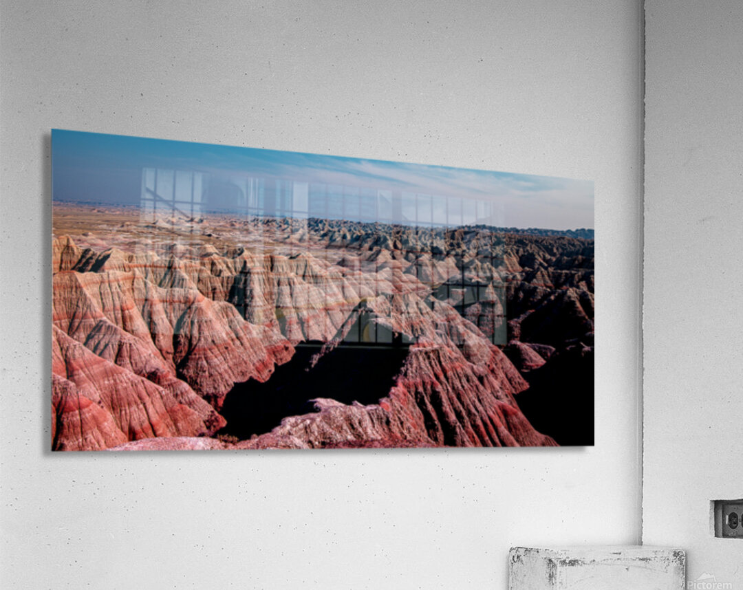 Embark on an extraordinary journey through the mesmerizing landscapes of the Badlands as we unveil the mysteries of this timeless terrain. My wife and I ventured through winding roads captivated by the awe-inspiring beauty of South Dakotas rugged landscape. Captured in full spectrum Mineral Symphony invites you to step into a world where time stands still and ancient secrets are whispered by the winds. Inspired by the stunning geological formations encountered during our drive this artwork portrays a landscape where each layer of rock tells a captivating story of Earths turbulent past. Intricate patterns of red pink and beige dance under a soft blue sky reflecting natures handiworks raw power and beauty. The rugged ridges and peaks draw you in urging you to connect with the ancient forces that have shaped this breathtaking landscape over millennia. Let the mysteries of Mineral Symphony wash over you as you immerse yourself in the beauty and wonder of the natural world inspired by the profound experiences of our journey through the Badlands of South Dakota.