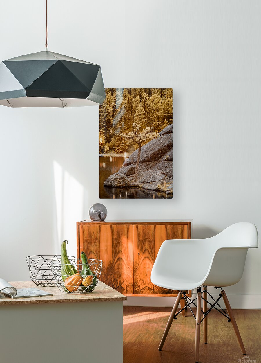 One tranquil afternoon I embarked on a solitary journey to Sylvan Lake nestled within the picturesque expanse of Custer State Park South Dakota. With my camera in tow I ventured forth to capture the serene beauty of the landscape in a unique light. As I traversed the winding trails encircling the lake I stumbled upon a breathtaking sight: a lone pine tree standing resolute upon a rocky outcrop amidst the tranquil waters. With the aid of my infrared lens the surrounding pine trees took on a mustard hue casting an enchanting glow upon the landscape. Against the backdrop of the lakes shimmering surface the solitary pine stood as a symbol of resilience and solitude. Beyond it a dense forest of pines stretched across the horizon their silhouettes bathed in the warm glow of the infrared spectrum. With a click of my camera I immortalized the scene capturing the essence of Sylvan Lakes tranquil majesty in all its splendor. The infrared image lent an otherworldly quality to the landscape transforming it into a realm of ethereal beauty. As I gazed upon the photograph I couldnt help but feel a sense of peace wash over me. In that fleeting moment amidst the quiet serenity of Sylvan Lake I felt a profound connection to the natural world and the timeless beauty it beholds.