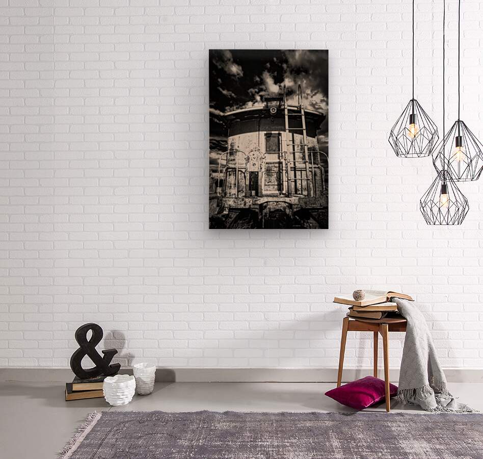 A black and white photograph capturing an old train car where rust and peeling paint evoke nostalgia and mystery set against a dramatic sky.