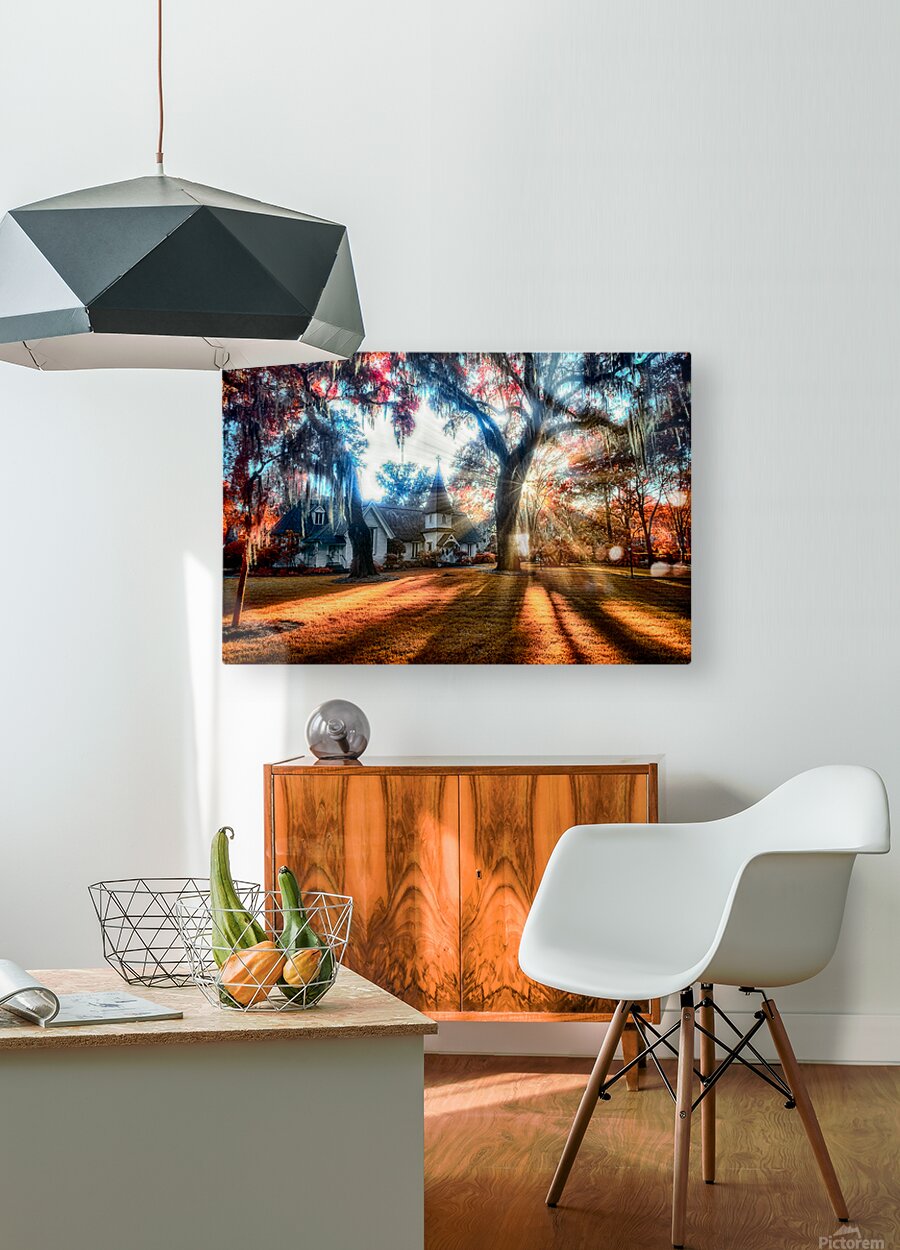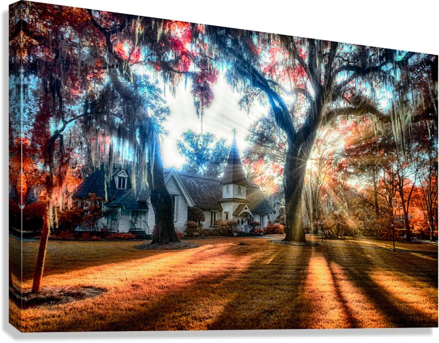 Embark on an immersive visual odyssey as we journey to the picturesque Saint Simons Island in Georgia where the historic Christ Church unfolds its timeless tale through the lens of an enchanting color infrared photograph. In this captivating image the church comes to life basking in the magical glow of sunlight that gracefully filters through the canopy of majestic trees casting a warm embrace over its storied structure. The scene unveils itself as a canvas painted with the hues of history and spirituality where the vibrant red tones of the foliage adorned with delicate Spanish moss that glistens like silken threads in the sunlight add a surreal touch to the landscape. The trees stand as guardians of time whispering the stories of centuries gone by. At the same time their vibrant colors create a harmonious dance with the enchanting glow of the surroundings. This photograph is more than a mere capture it is a visual symphony that resonates with the rich tapestry of Saint Simons Islands history. The church a beacon of spiritual significance stands as a testament to the enduring allure of the island. As the sunlight bathes the scene it becomes a vessel through which the past is brought to life inviting viewers to stroll through the corridors of time. Every architectural detail of Christ Church illuminated in this radiant photograph echoes the devotion and craftsmanship of eras long past. Light and shadows create a dynamic interplay casting a spell transcending the present moment. The surreal red hues and the delicate Spanish moss become storytellers weaving tales of a bygone era imbued with a sense of spirituality and reverence. This photograph encapsulates more than just the external beauty it encapsulates the intangible essence of Saint Simons Island. It invites viewers to connect with the spirit of the place to feel the echoes of prayers and the weight of history in the air. The image becomes a doorway transporting us to a place where time seem