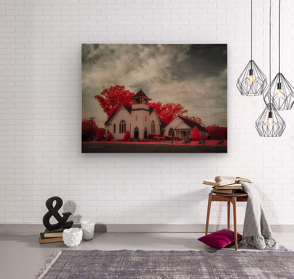 Where sacred meets surreal a white steeple pierces crimson dreams. Through infrareds revealing eye even familiar sanctuaries become gateways to wonder. Some churches dont just reach skyward - they touch imagination.