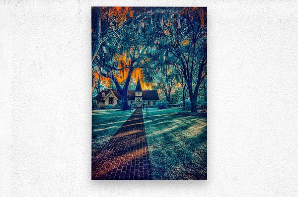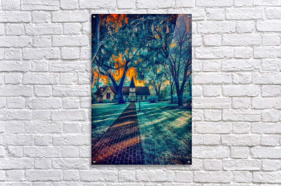The Enchanting Christ Church on Saint Simons Island Georgia. Step into a realm of mesmerizing beauty with the Blue Church capture of Christ Church on Saint Simons Island Georgia. In this infrared masterpiece the iconic church is bathed in a golden sky surrounded by enchanting blue trees casting deep shadows and accentuated by pronounced sunrays. A journey prompted by whispers led my wife and me to this captivating site. As we beheld Christ Church the play of light and shadow the ethereal blue tones and the golden hues created a visual symphony. Titled Golden Hues and Ethereal Blues this photograph invites you to explore the mystical charm of a church that transcends the ordinary.