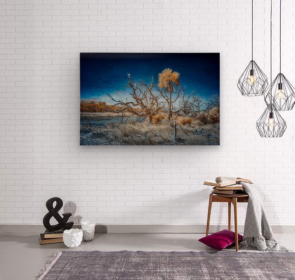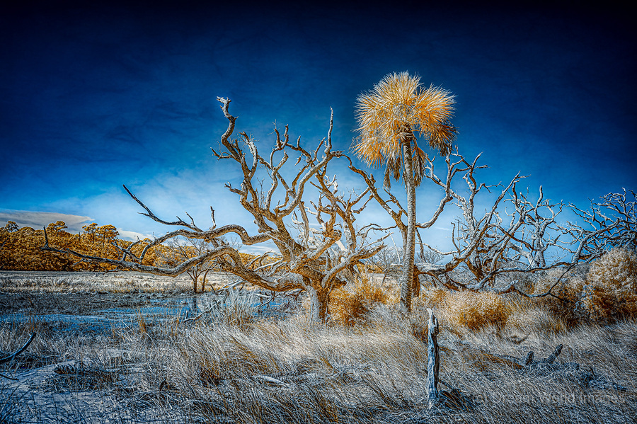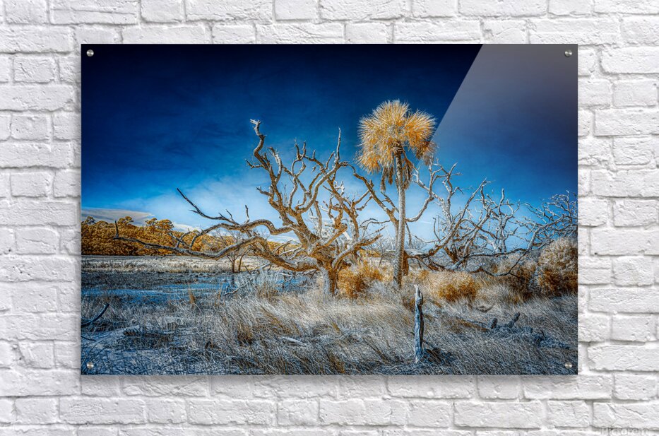 Step into a realm where natures poetry comes alive – witness the haunting beauty of Driftwood Beach nestled on the shores of Jekyll Island Georgia. In this mesmerizing infrared image a scene of ethereal tranquility unfolds before your eyes. At the end of a row of majestic dead trees weathered by time and tides stands a lone palm tree its silhouette striking against the marshy expanse. Like a sentinel guarding over the landscape it stands tall a testament to resilience amidst the elements. Through the lens of infrared photography the world transforms into a surreal dreamscape where reality merges with imagination. In this timeless spectacle hues of infrared breathe life into the scene infusing it with an otherworldly glow that dances across the landscape. Here natures melancholic beauty takes center stage weaving a tale of contrasts and serenity. The juxtaposition of life decay stillness and motion creates a visual symphony that resonates deep within the soul. As you gaze upon this captivating image let yourself be transported to a realm where time stands still and the whispers of the wind carry the secrets of centuries past. Driftwood Beach beckons inviting you to lose yourself in its mesmerizing embrace and discover the profound beauty that lies within. Experience the magic of Driftwood Beach – where every photograph tells a story and every moment is a masterpiece waiting to be captured.