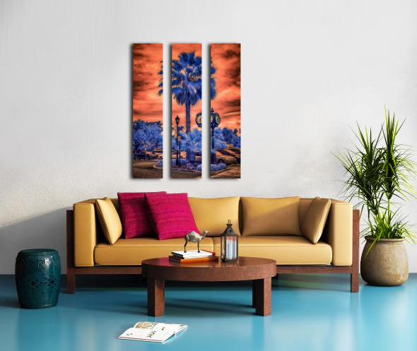 Inverness Florida known for its picturesque charm becomes a mesmerizing canvas in this colorful infrared image capturing the town clock against a backdrop of radiant hues. Tall palm trees sway gracefully framing the clock tower while cars in the parking lot add a sense of bustling activity. The sky transforms into a burnt orange spectacle as the sun sets casting a warm glow over the scene. In this surreal landscape the foliage takes on an otherworldly appearance bathed in deep shades of blue almost bordering on purple. This captivating snapshot is a testament to the beauty of Inverness where nature and human-made structures harmoniously coexist creating a vibrant and enchanting scene. Whether youre a local resident or a curious traveler this image is sure to captivate your imagination and leave you in awe of the stunning scenery that Inverness has to offer.